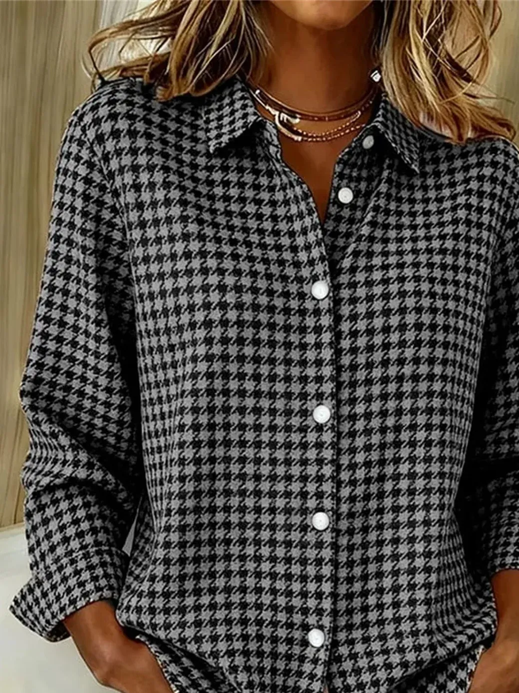 Women's Long Sleeve Shirt Spring/Fall Gray Houndstooth Buckle Shirt Collar Regular Sleeve Daily Going Out Casual Top