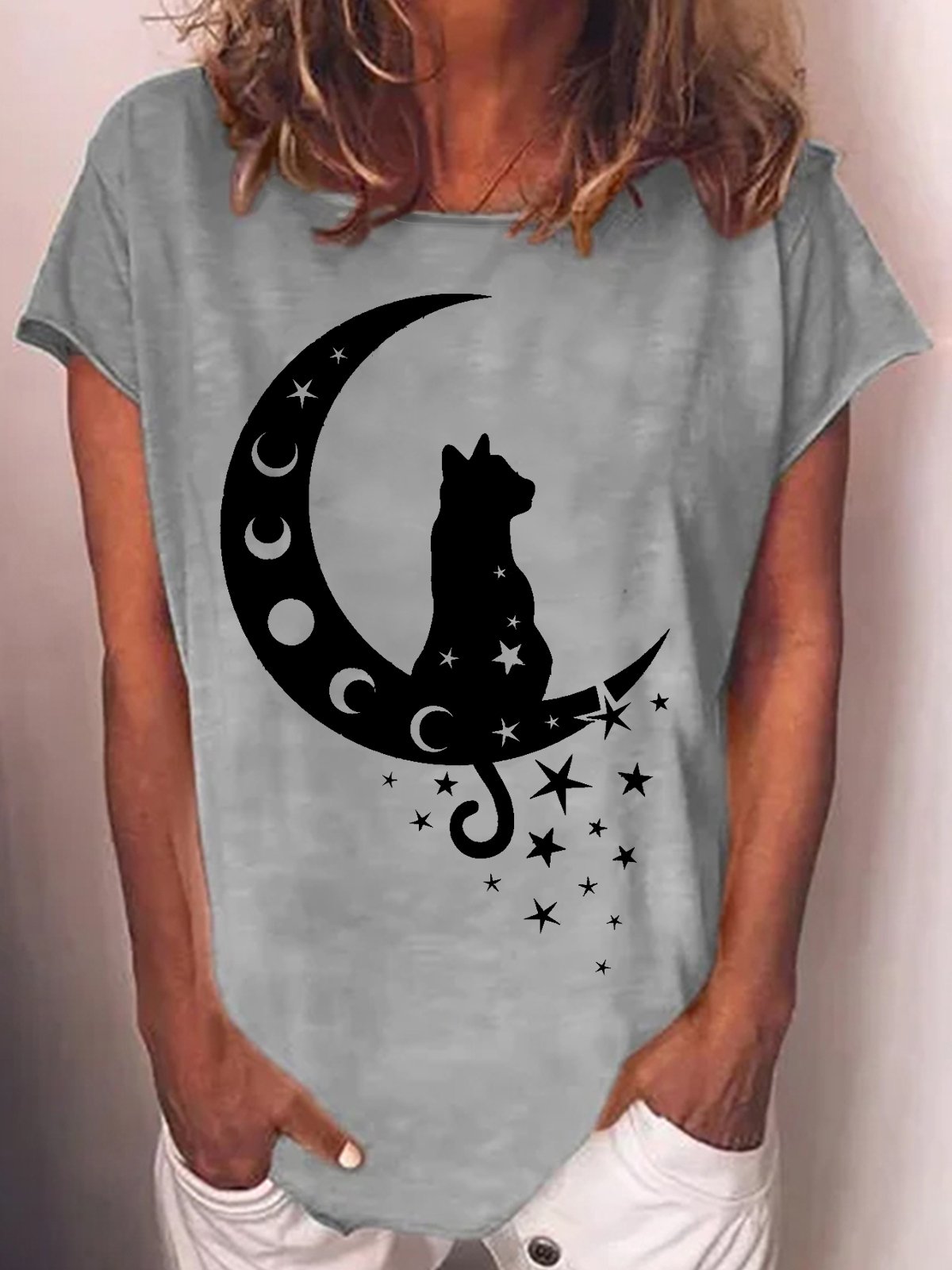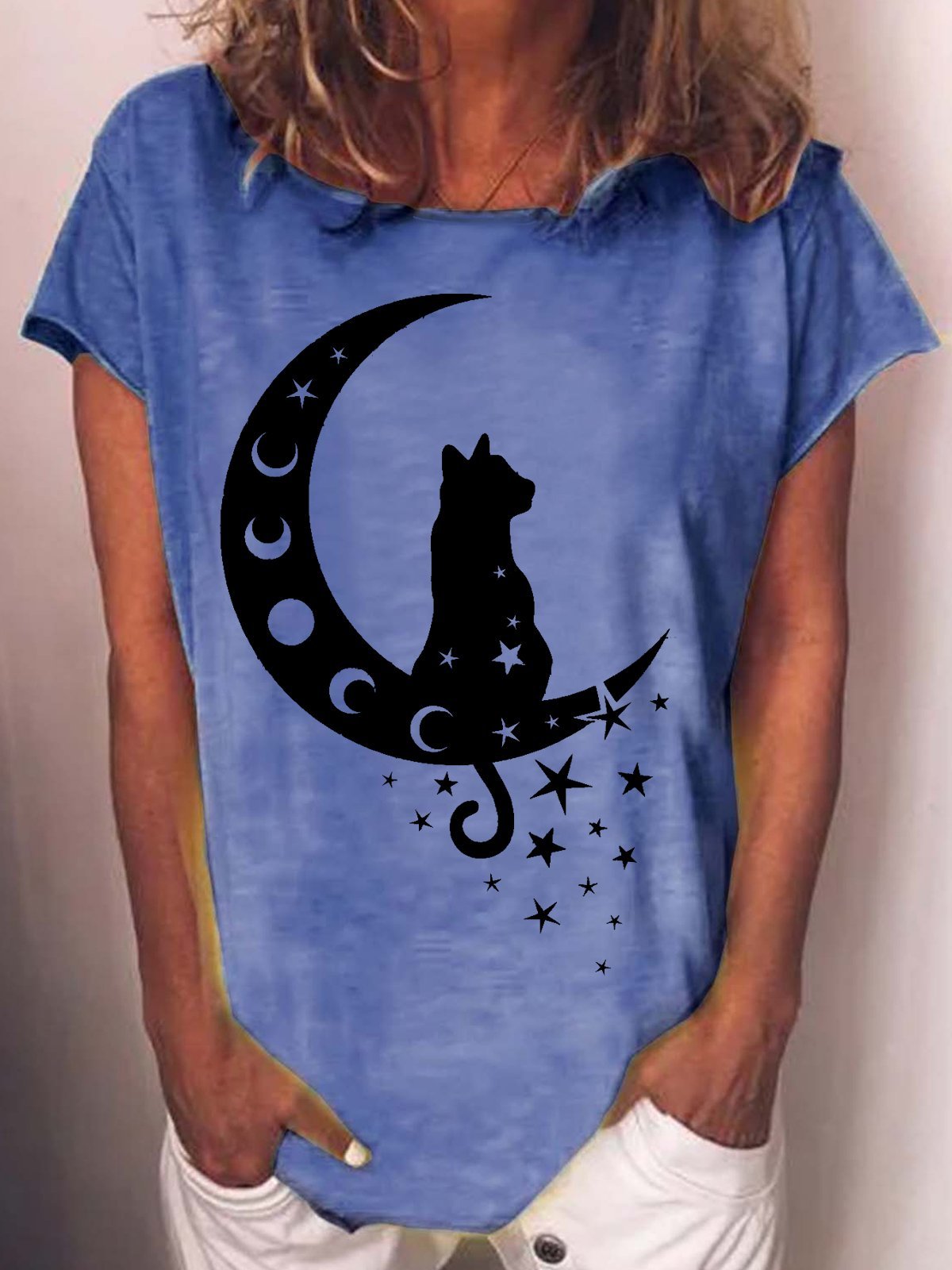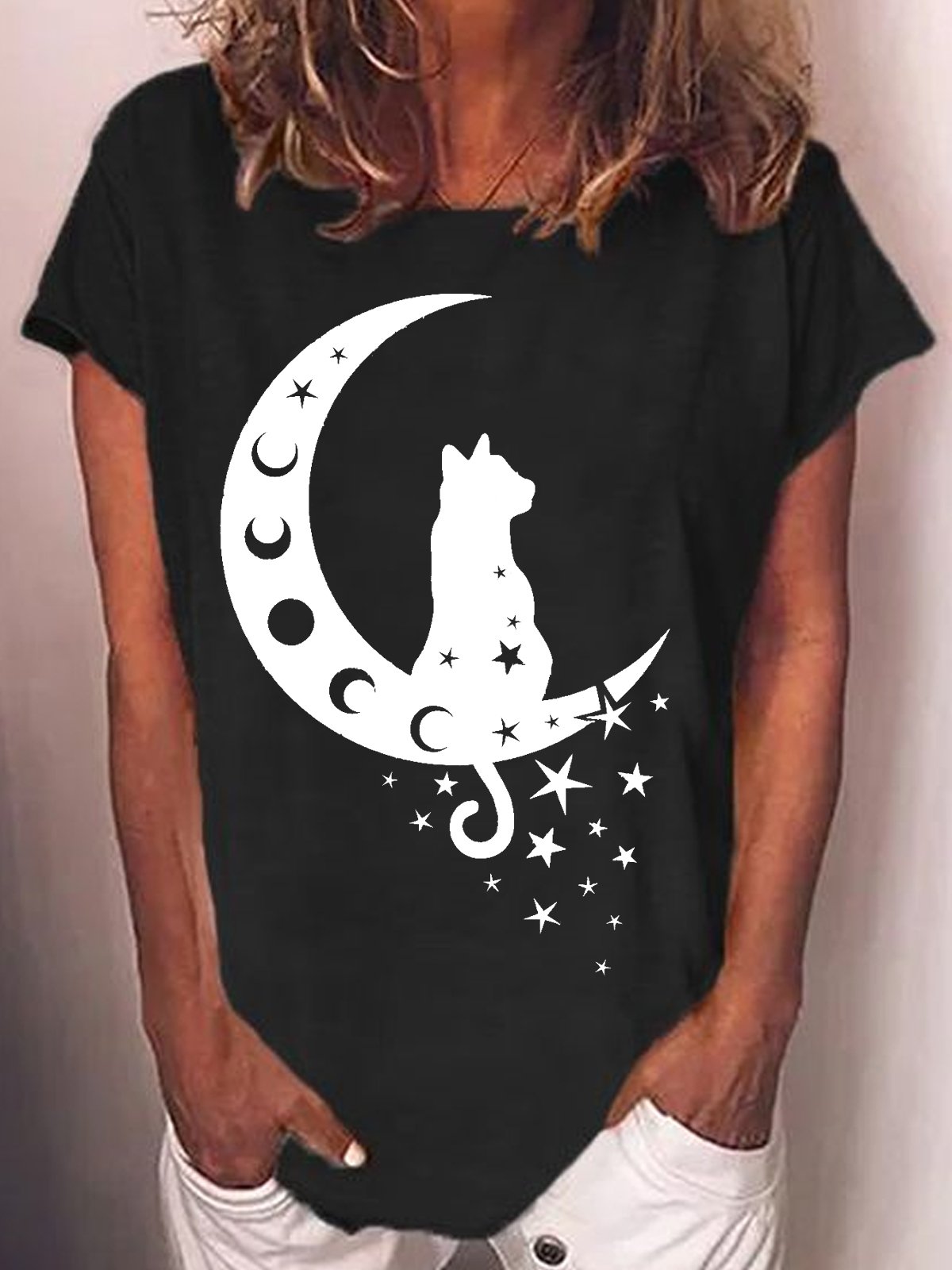 Womens Cat and Moon Casual Crew Neck T-Shirt