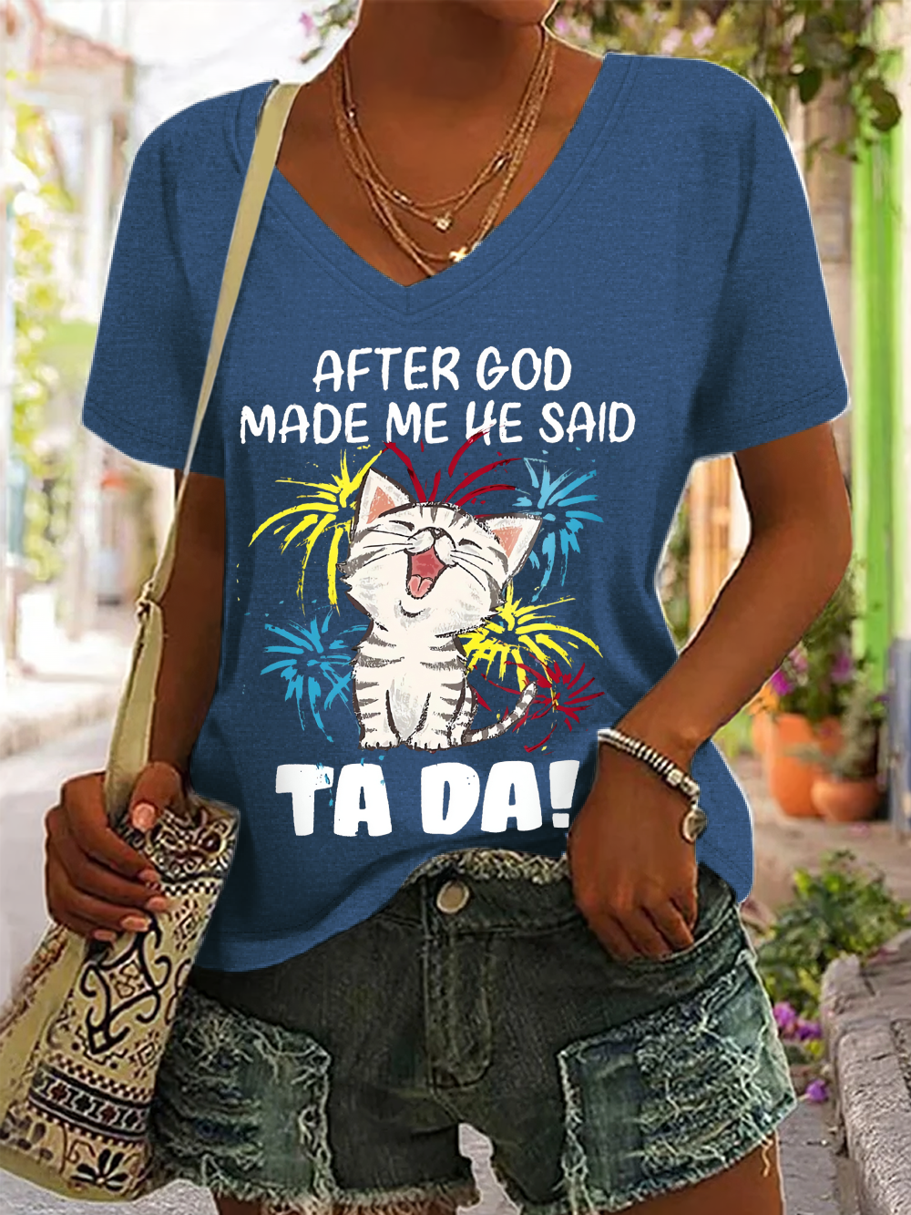 Women's Funny Cat After God Made Me He Said Ta Da Casual V Neck Cotton T-Shirt