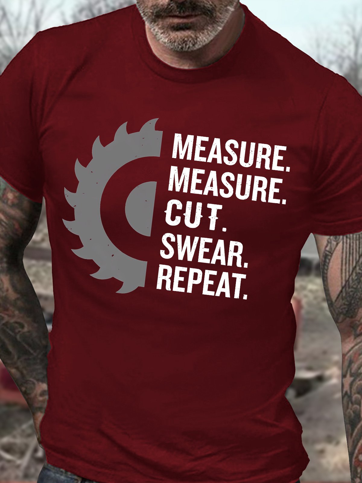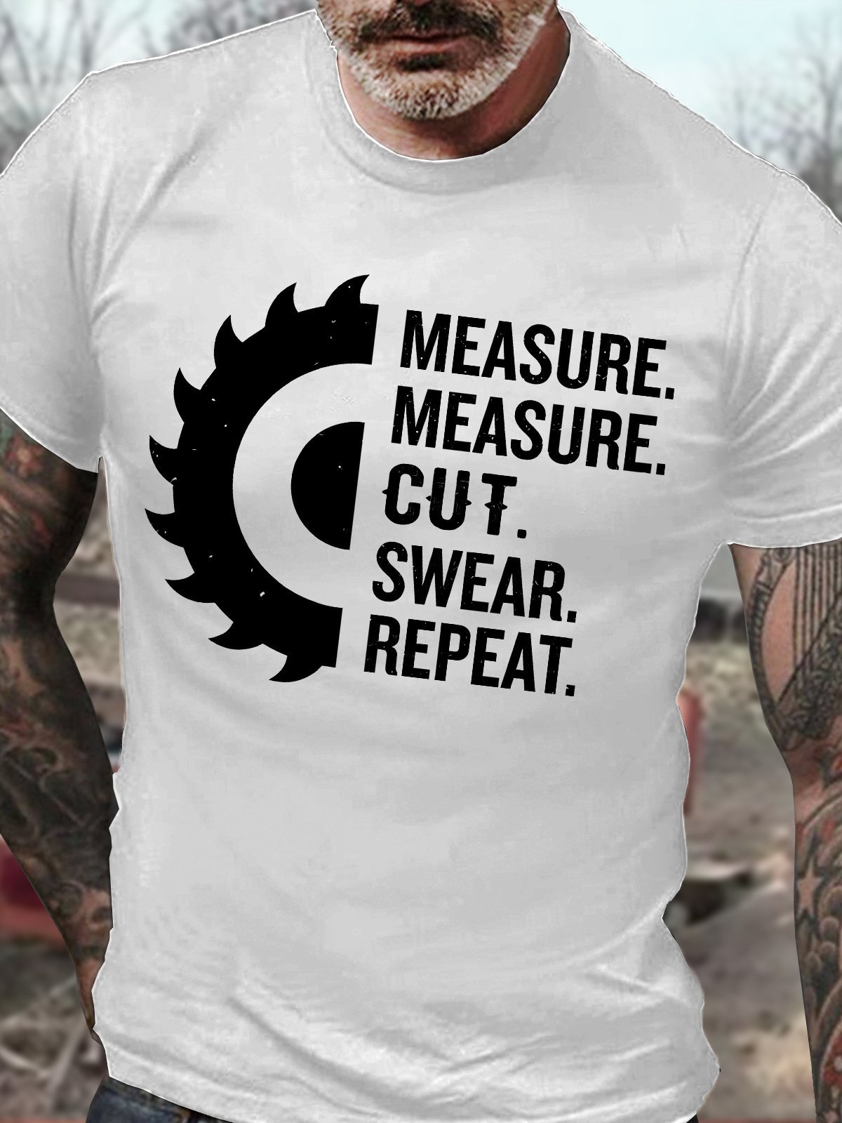 Men's Measure Measure Cut Swear Repeat Wood Working Funny Graphic Printing Crew Neck Cotton Casual Text Letters T-Shirt