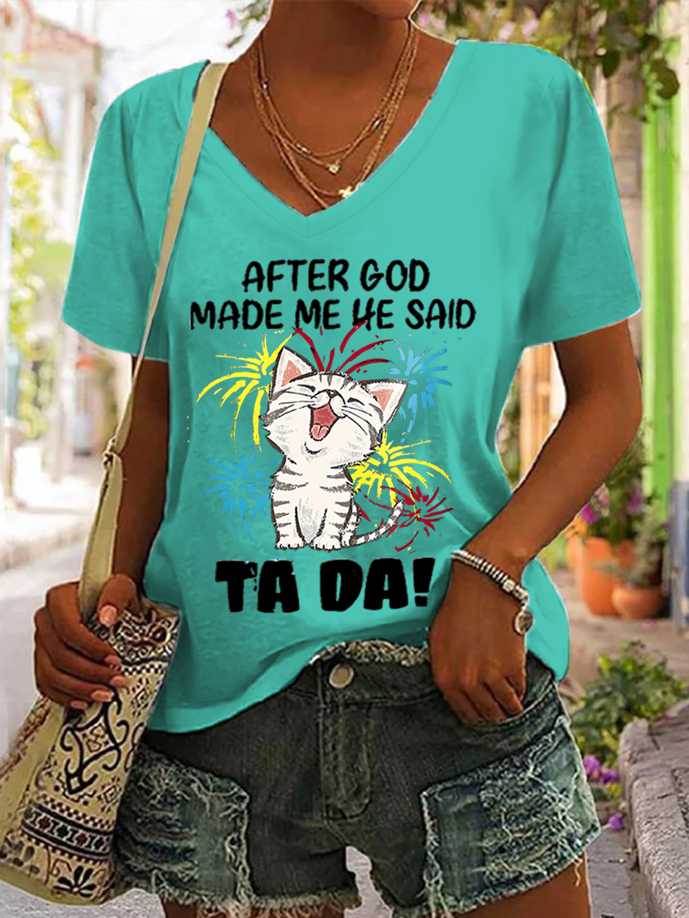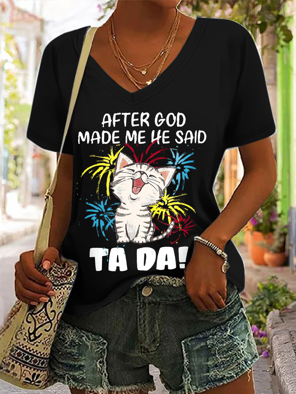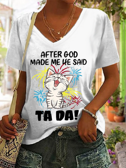 Women's Funny Cat After God Made Me He Said Ta Da Casual V Neck Cotton T-Shirt