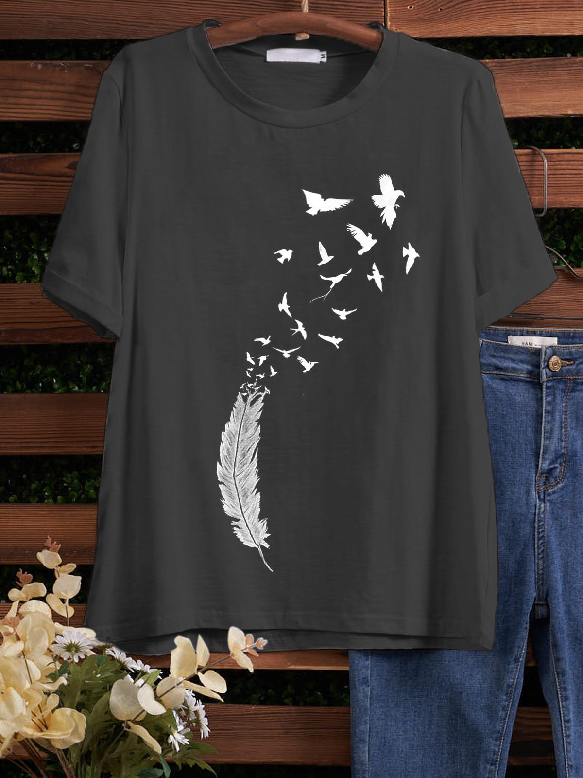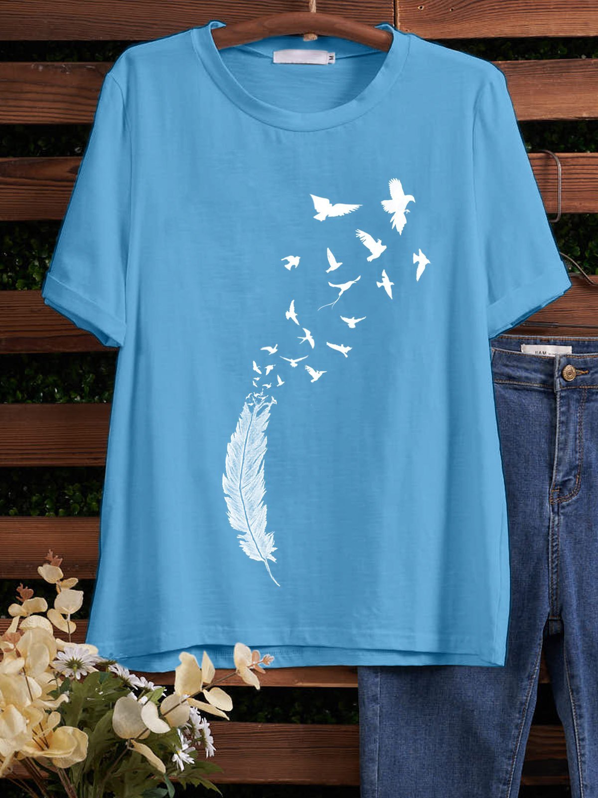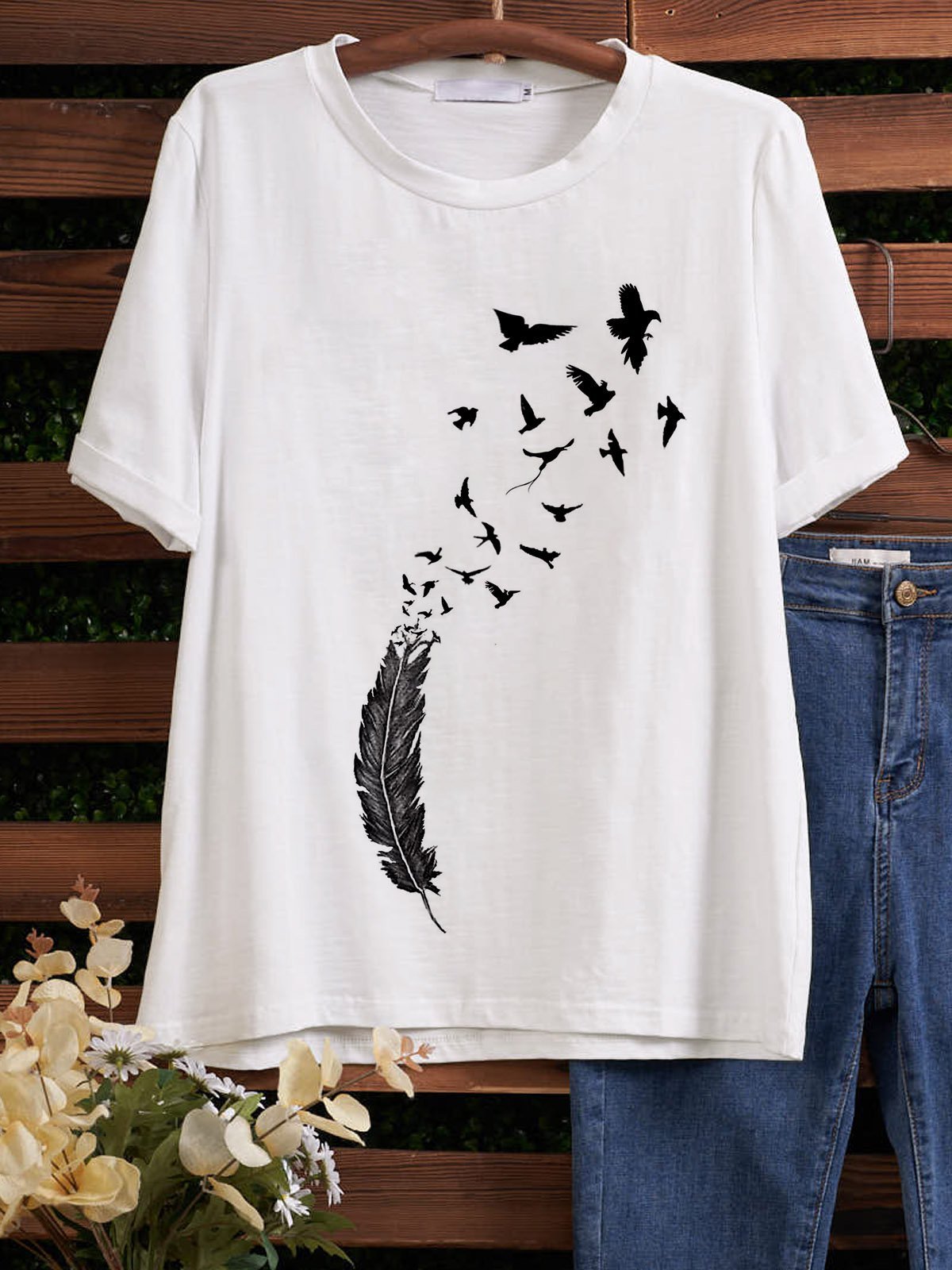 Crew Neck Short Sleeve Cotton-Blend Feather print Shirt & Top