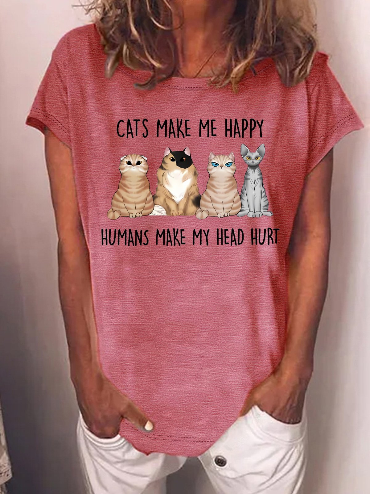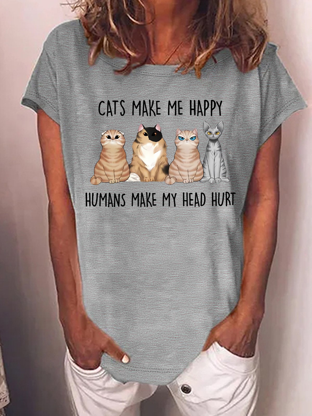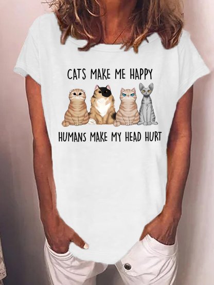 Women's Cat Make Me Happy Humans Makes My Head Hurt Funny Cat Graphic Printing Loose Text Letters Cotton-Blend Casual T-Shirt