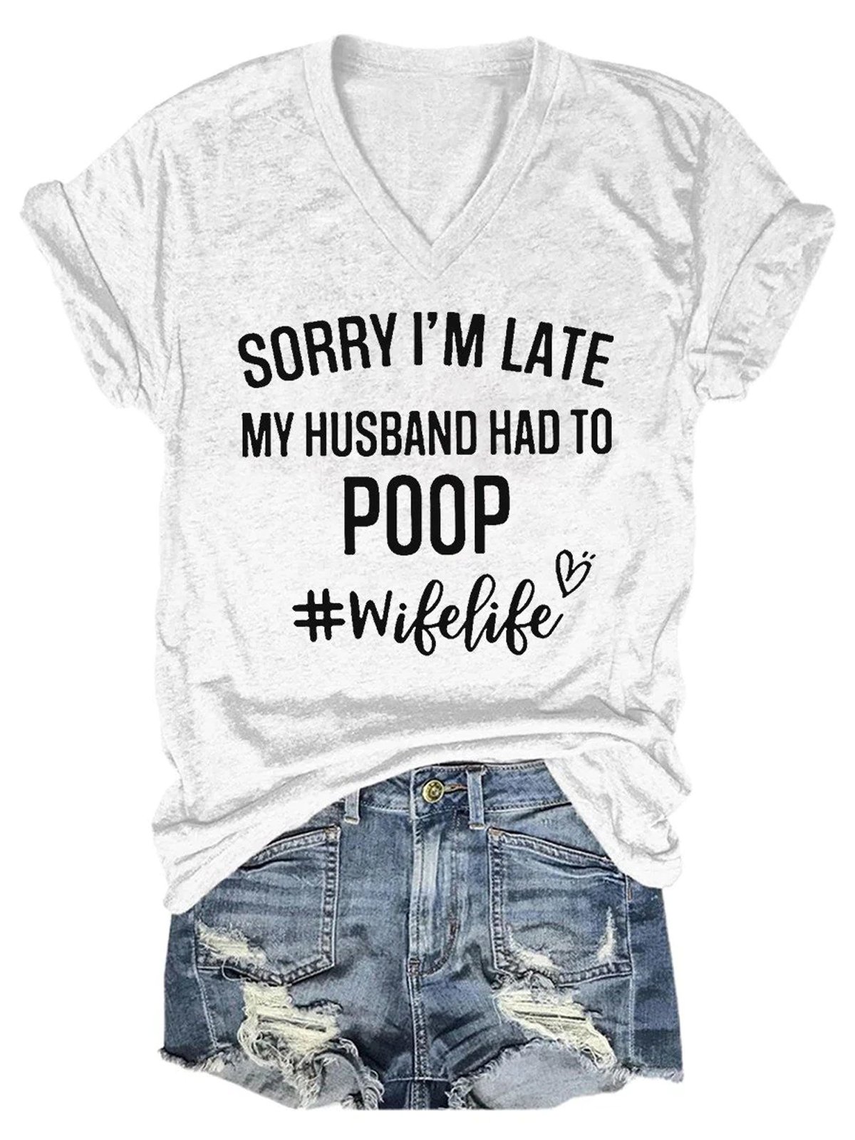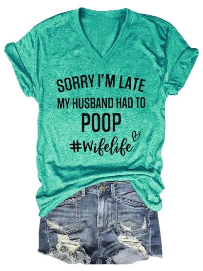 Women's Funny Sorry I'm Late My Husband Had To Poop V-Neck T-Shirt
