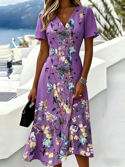 Botanical Pattern Regular Fit V Neck Casual Dress With No