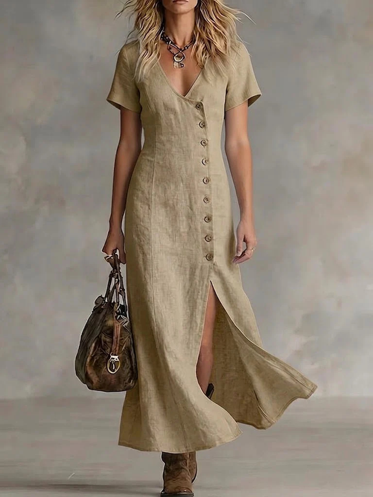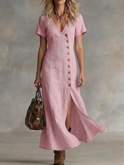 Cotton And Linen V Neck Short Sleeve Button Spring Summer Casual Maxi Dress