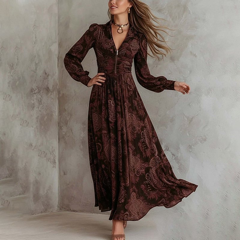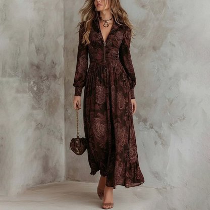 Retro Vacation Print Long-Sleeved V-Neck Fitted Waist Puff Sleeve Maxi Dress