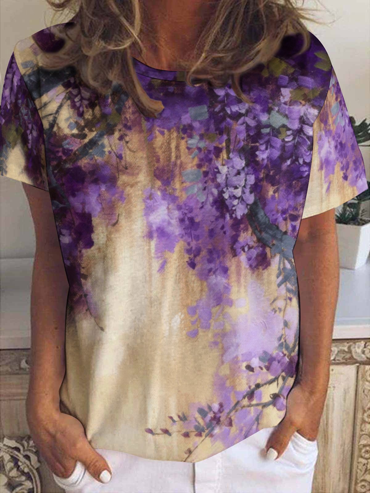 Women’s Plant Pattern Floral Cotton-Blend Casual T-Shirt
