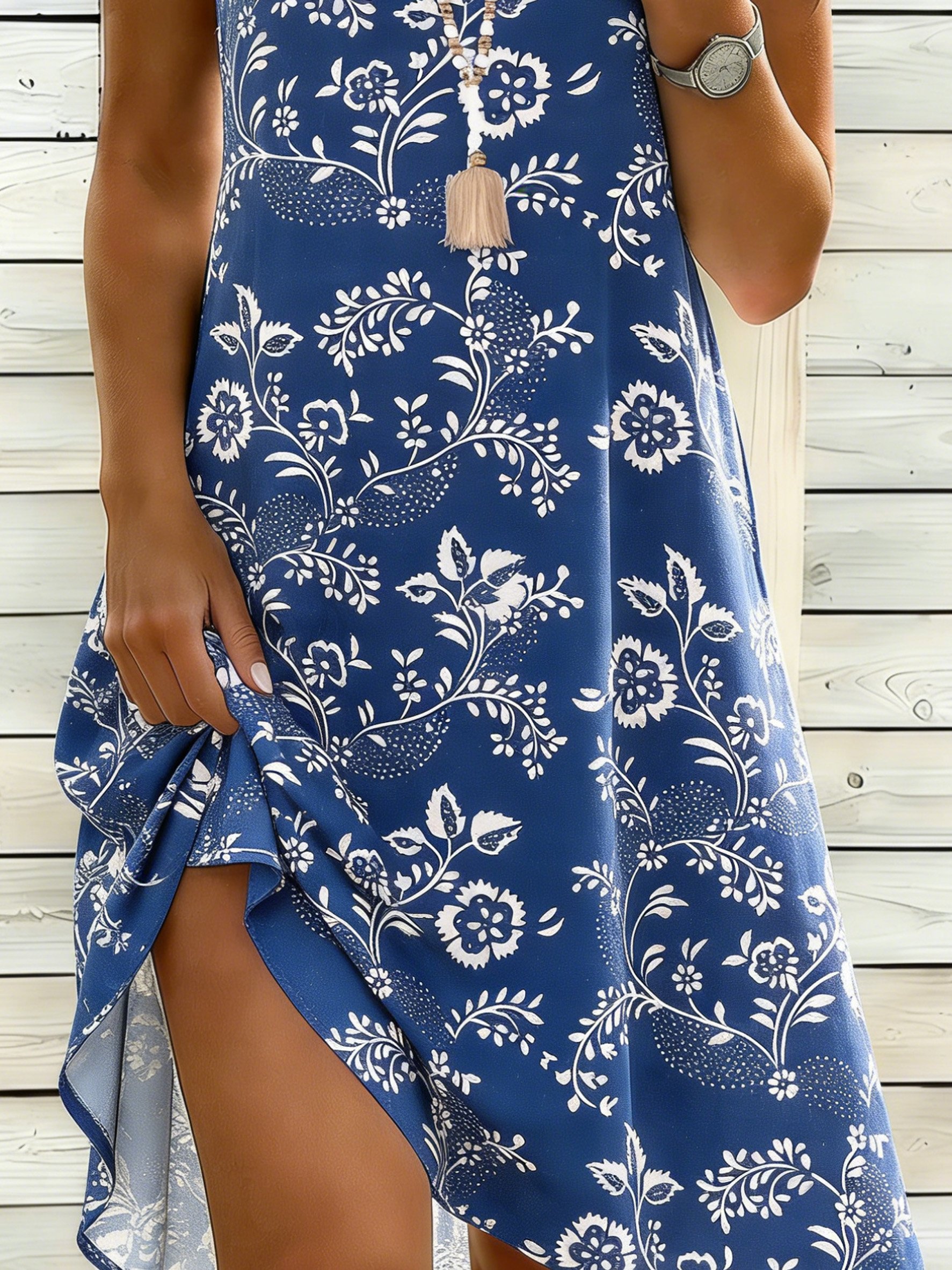 Cotton Denim Blue Floral Printing V Neck Sleeveless Summer Vacation Casual Dress