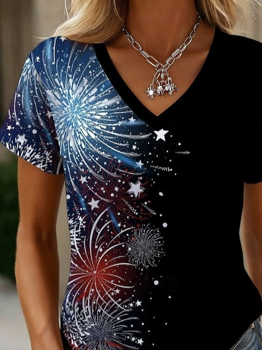 Cotton Casual Gradient Pattern V Neck T-Shirt