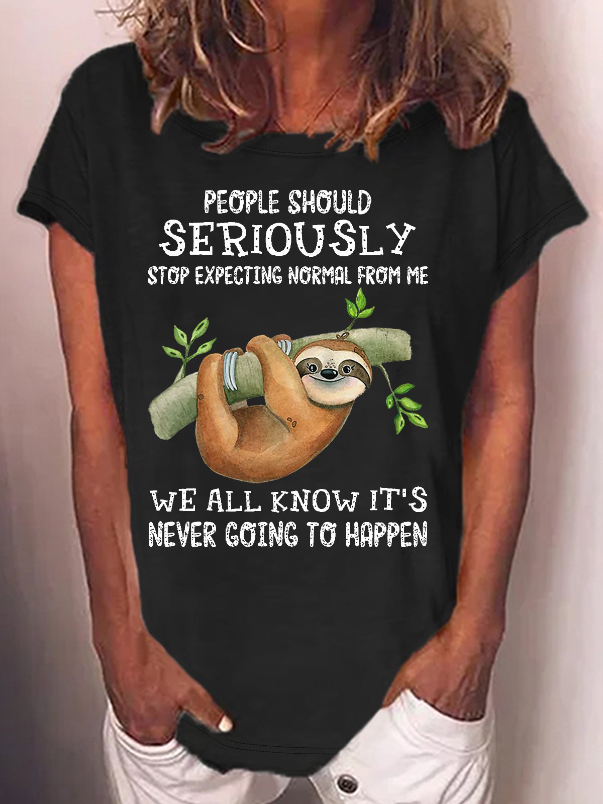Women‘s Sloth Stop Expecting Normal From Me Letters Casual Crew Neck T-Shirt