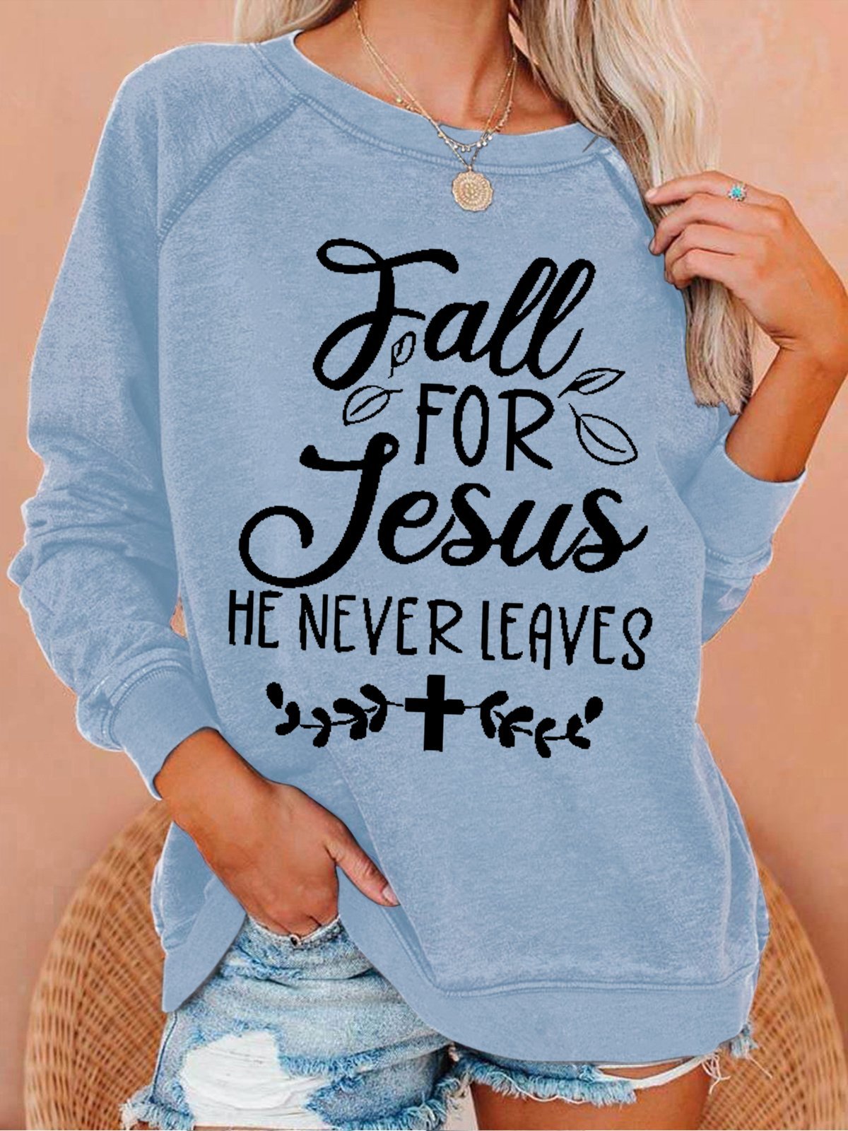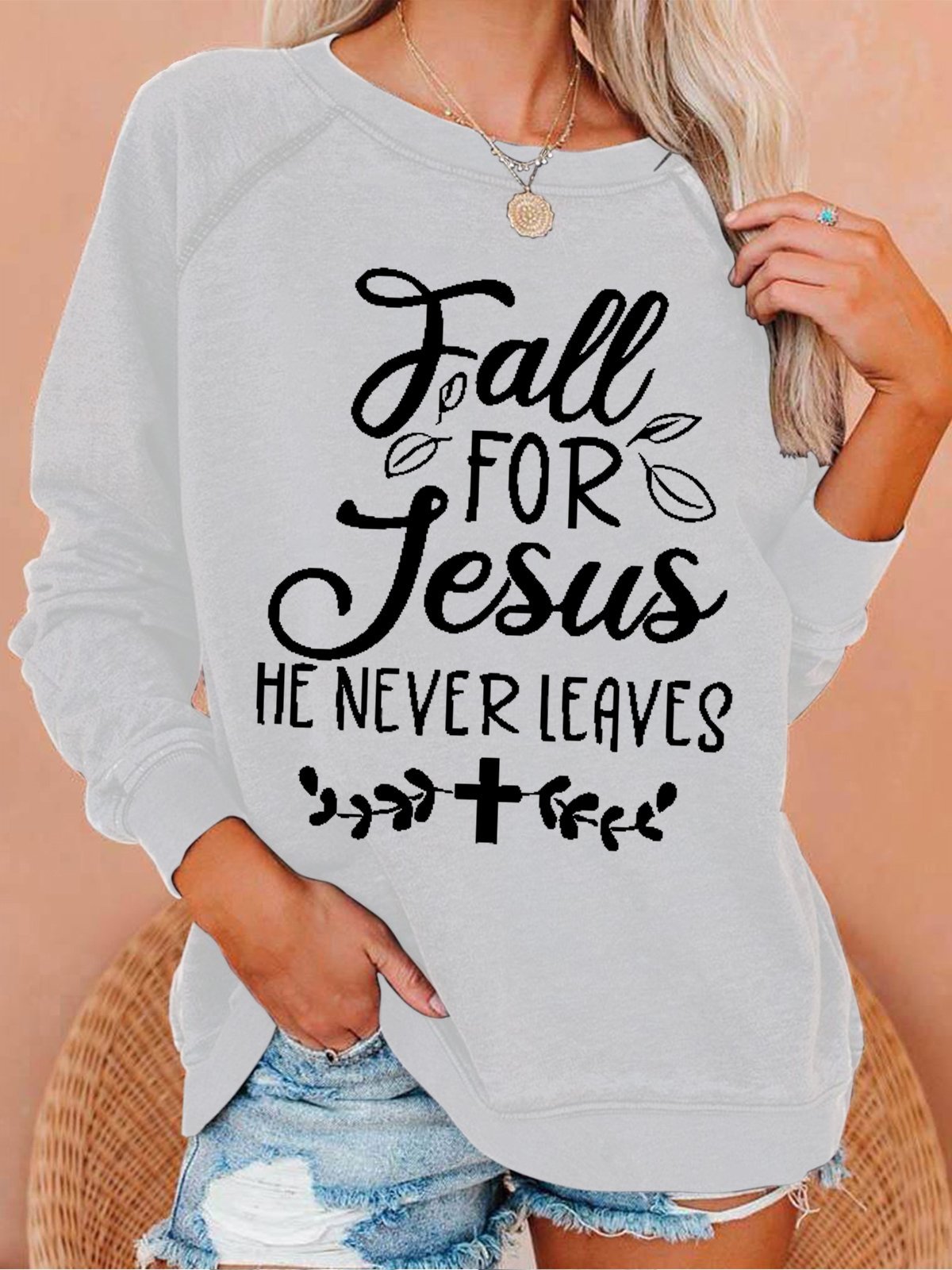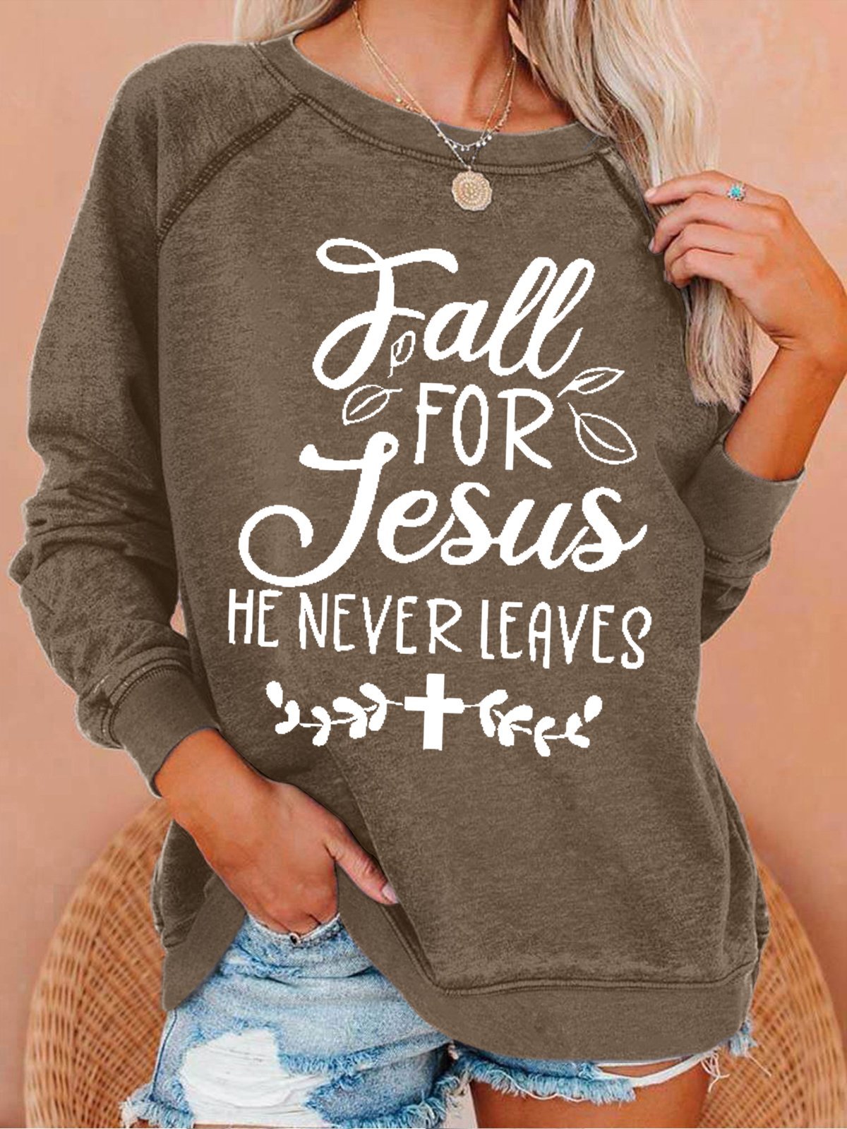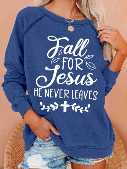 Women's Fall For Jesus He Never Leaves Text Letters Loose Sweatshirt