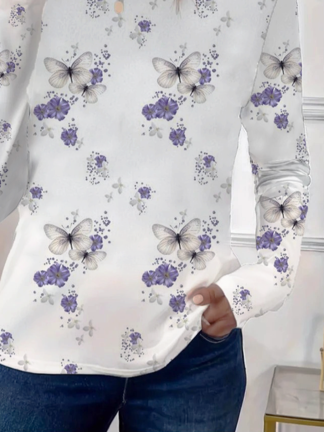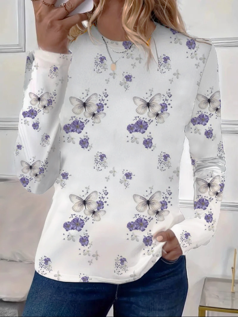 Women's Floral Butterfly Print Casual Round Neck Long Sleeve T-Shirt
