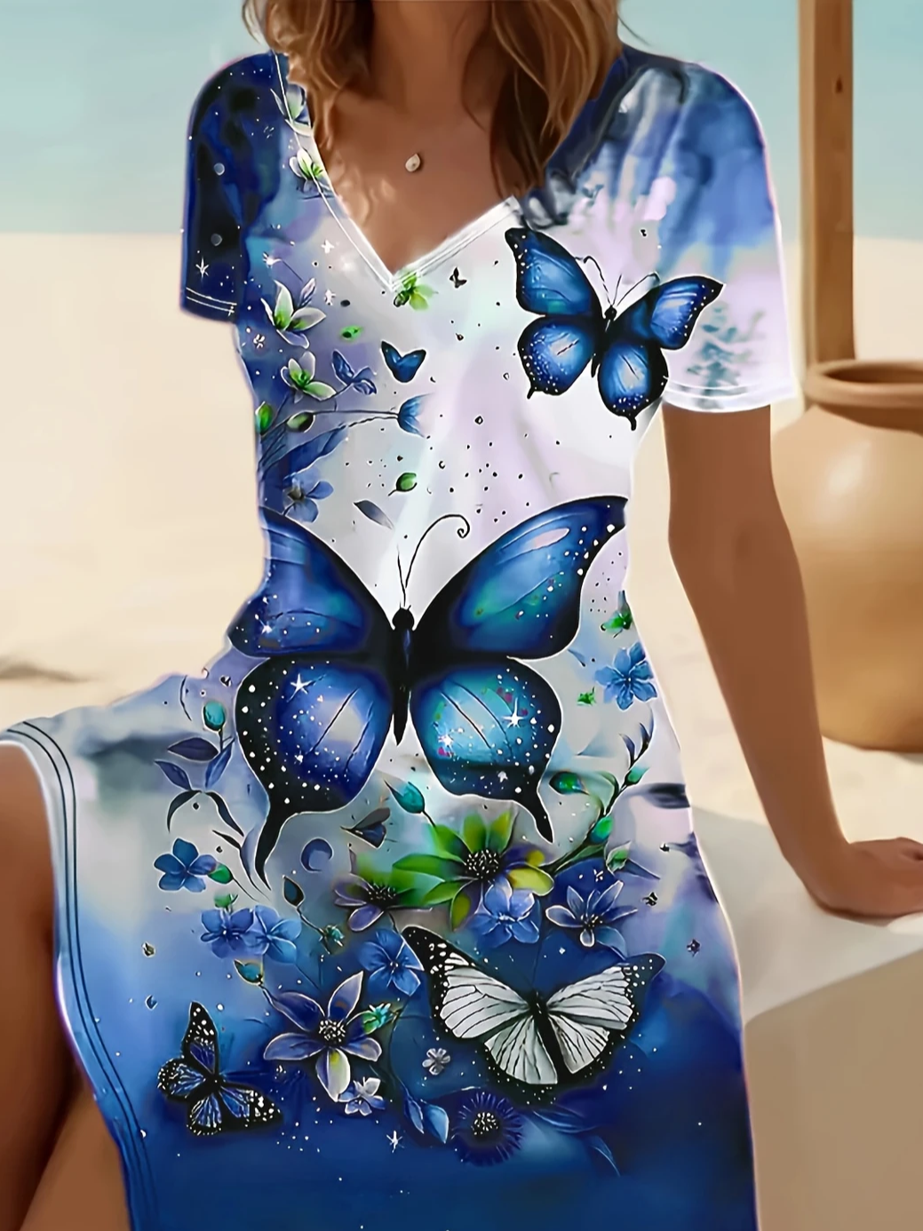Women's Floral Butterfly Print Casual V-Neck Short Sleeve Dress