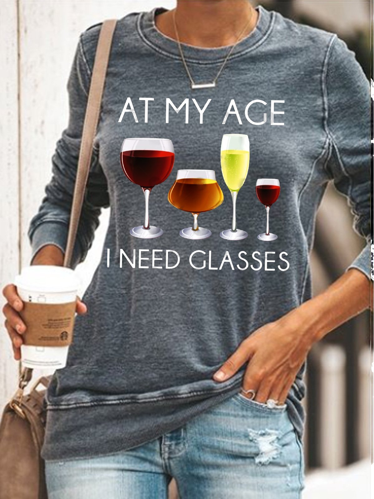 Womens Funny Alcohol At My Age I Need Glasses Casual Crew Neck Sweatshirt