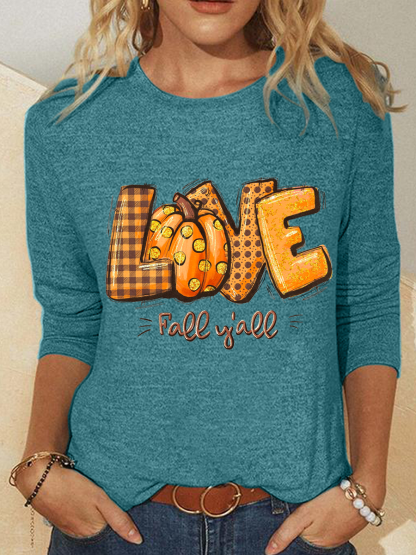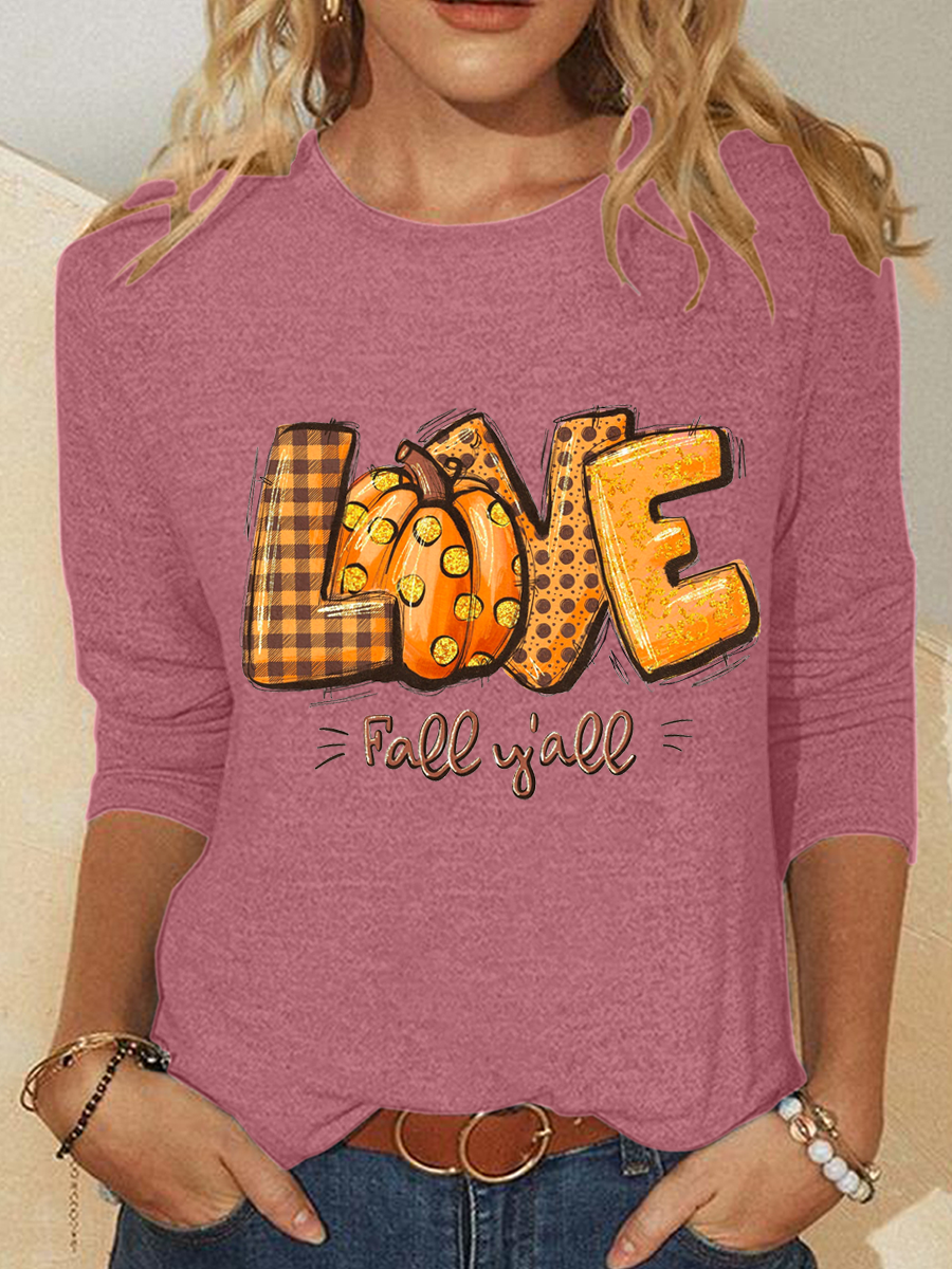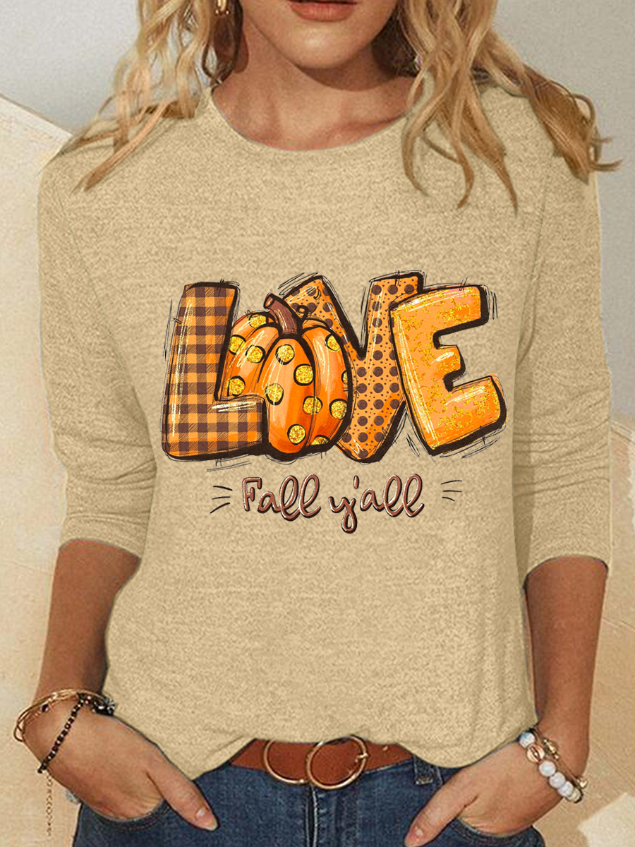 Love Fall Y'all Crew Neck Cotton-Blend Casual Text Letters Long Sleeve Shirt