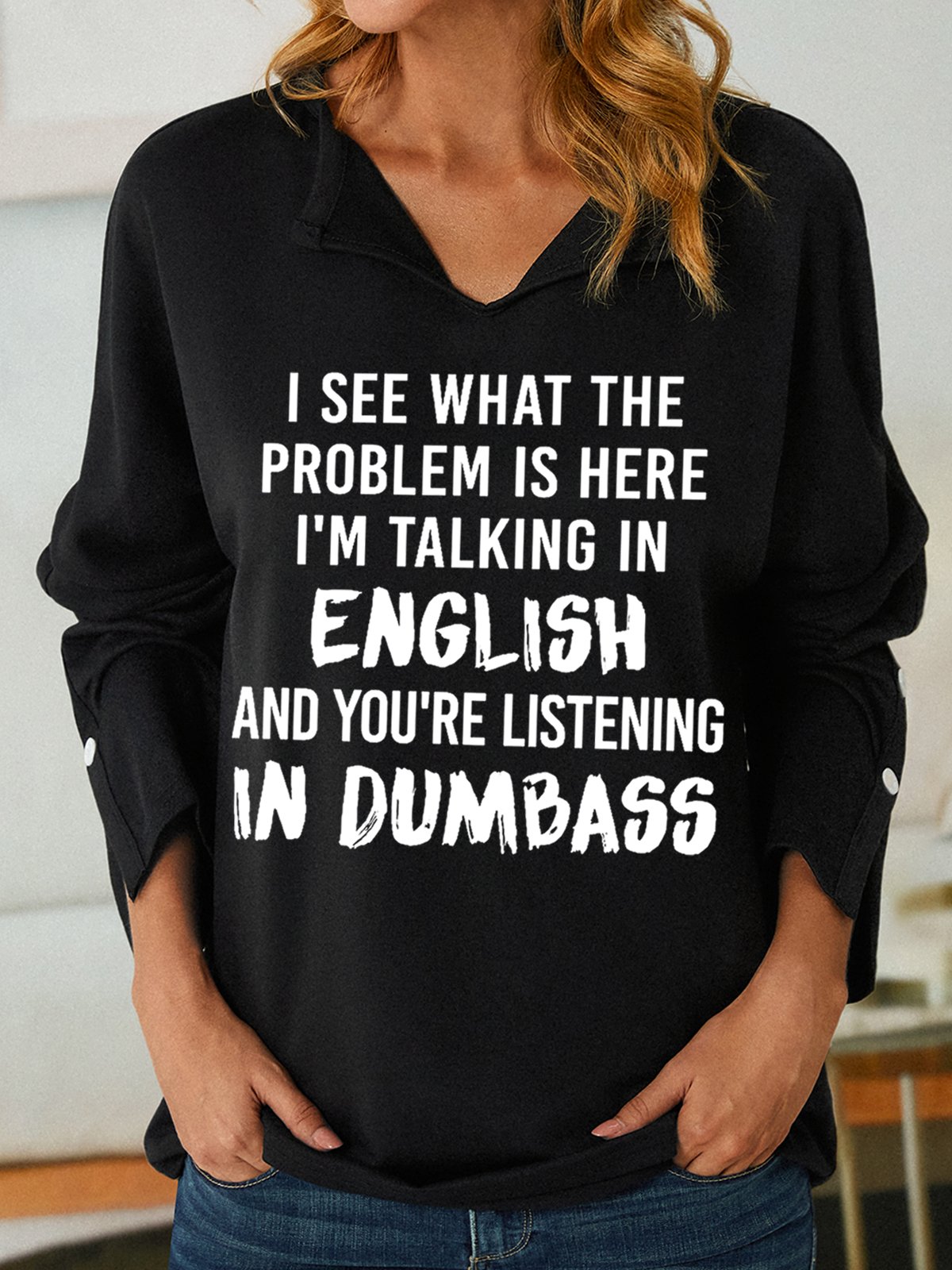 Women Funny Saying I See What The Problem Is Here I’M Talking In English And You’Re Listening In Dumbass V Neck Sweatshirt