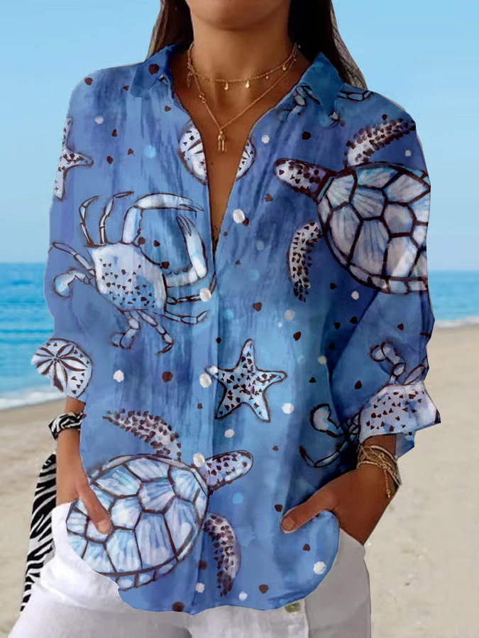 Women's Turtle Art Print Lapel Resort Shirt