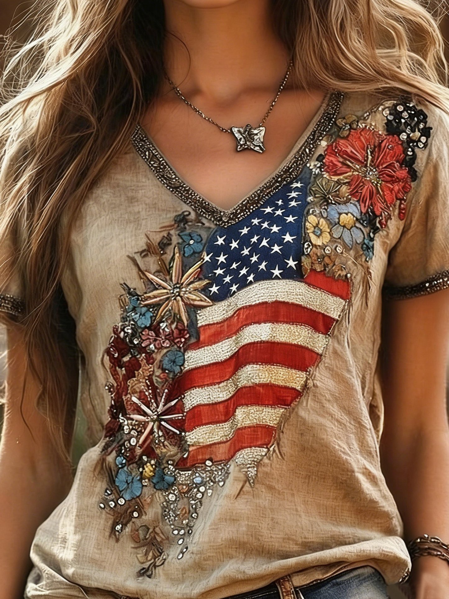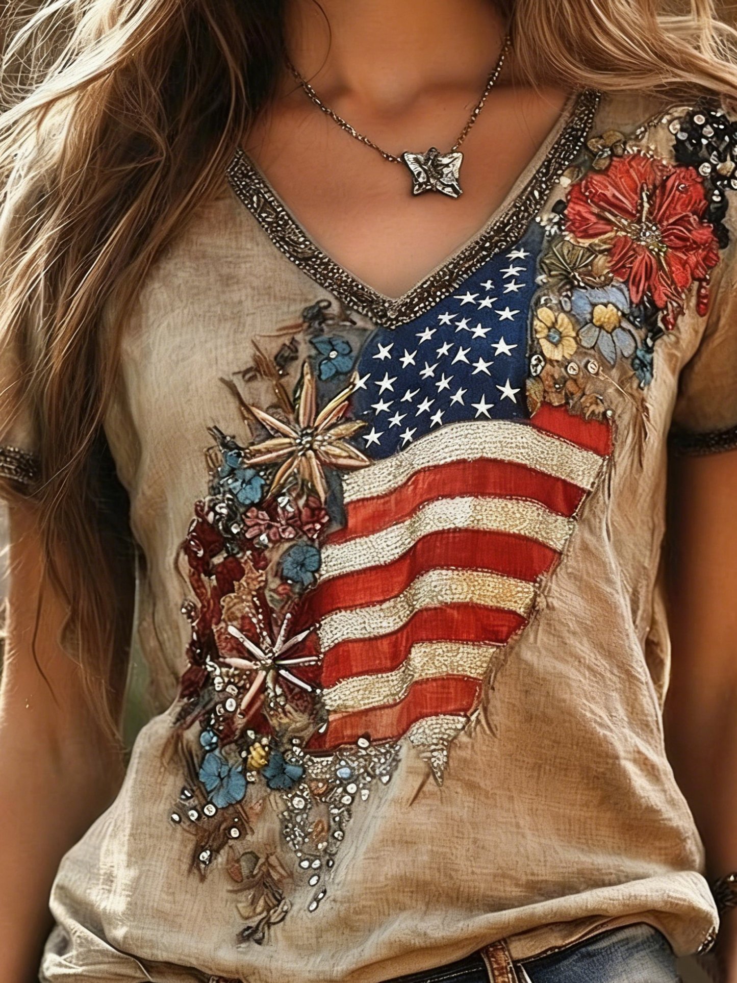 250th Anniversary V Neck America Flag Embroidery Roes Summer Linen Look Vintage Casual T-Shirt