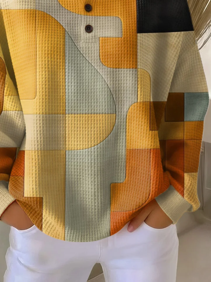 Women's Abstract Print Button-Up Casual Waffle Knit Sweatshirt