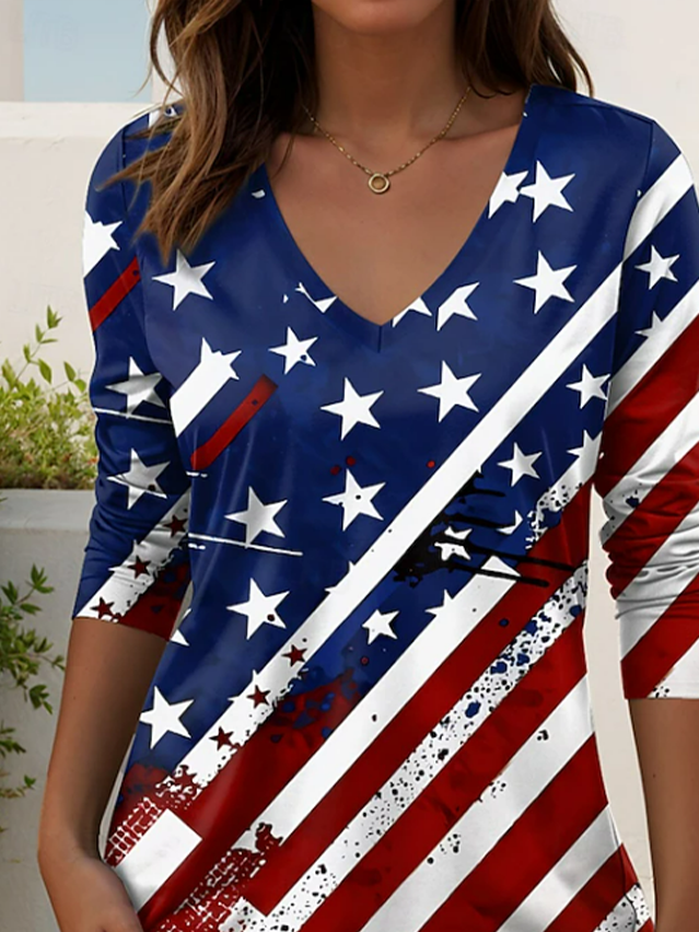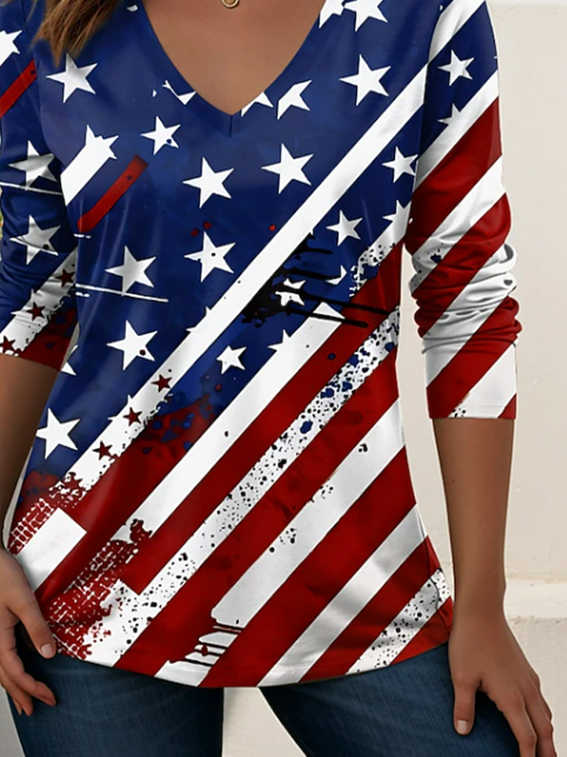 Women's USA 250th Anniversary Long Sleeve T-shirt Spring/Fall As Picture America Flag Printing V Neck Holiday Going Out Casual Top
