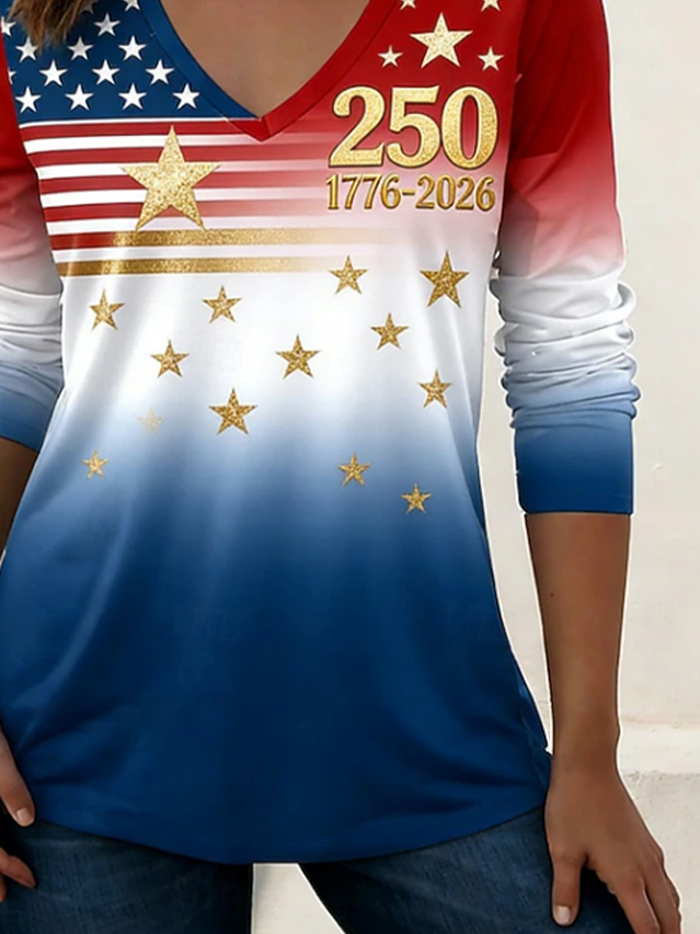 Women's USA 250th Anniversary Long Sleeve T-shirt Spring/Fall As Picture America Flag Printing V Neck Holiday Going Out Casual Top