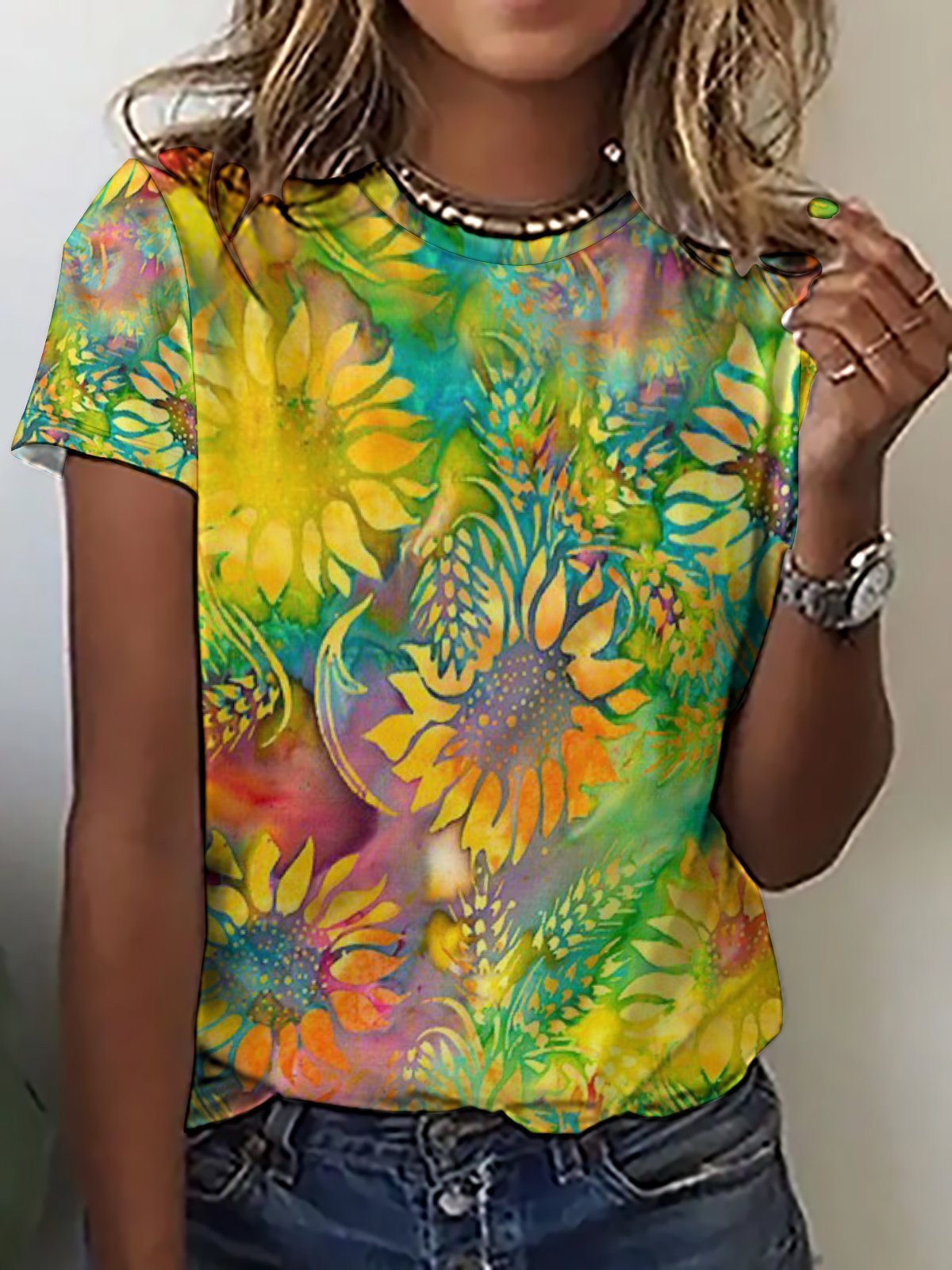 Casual Abstract Sunflower Print Crew Neck Short Sleeve T-Shirt