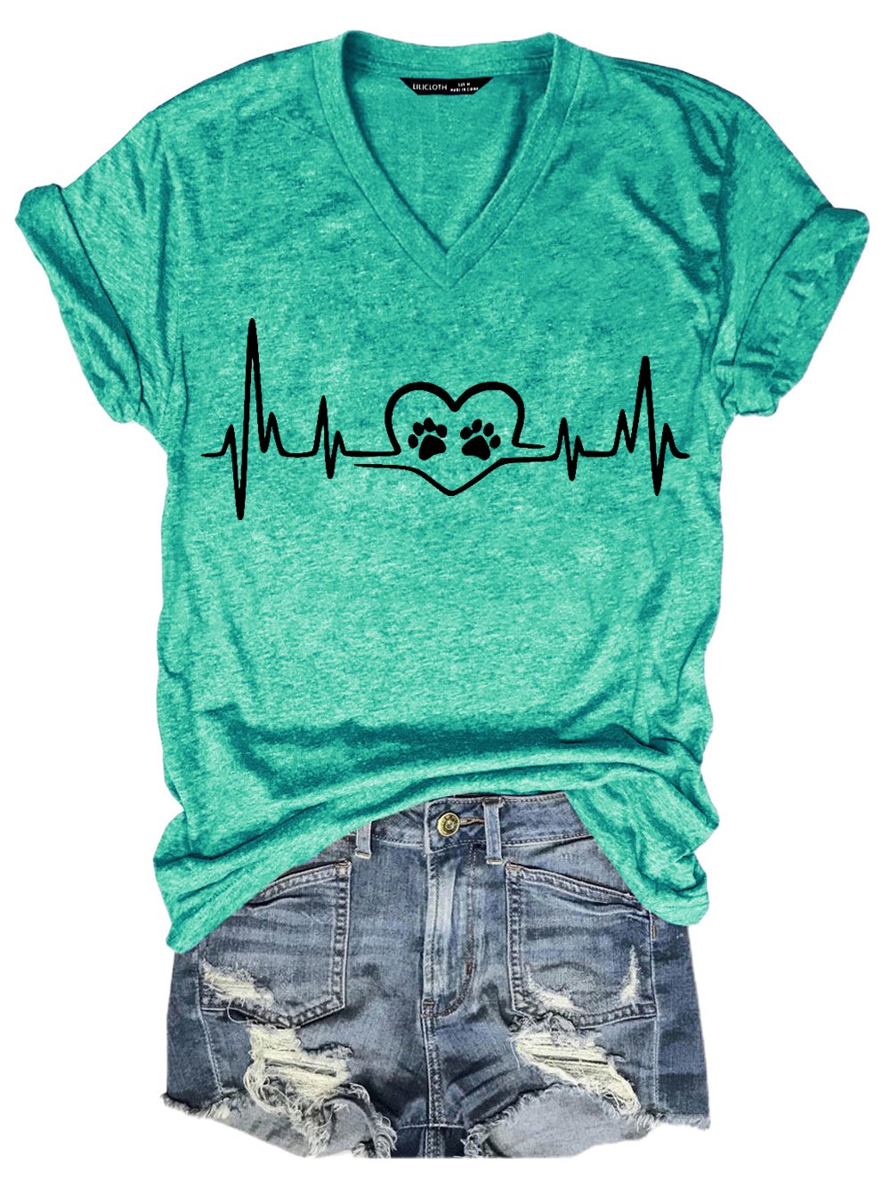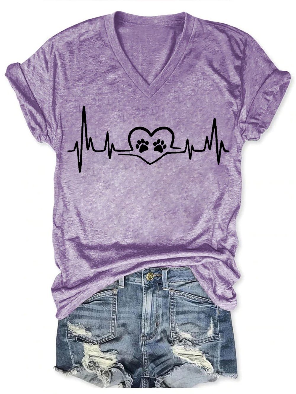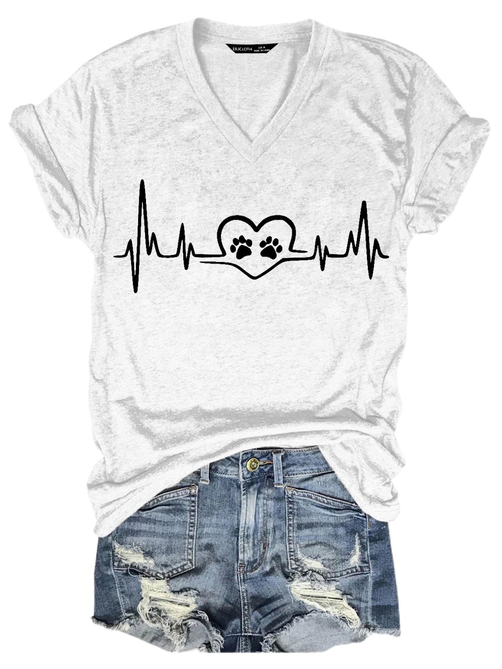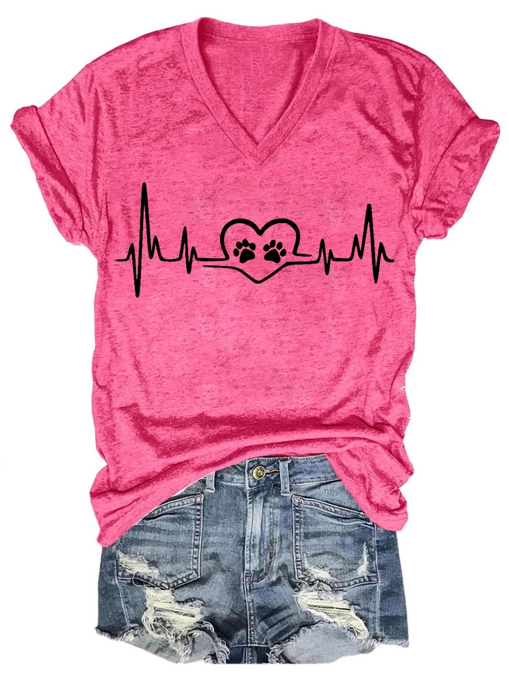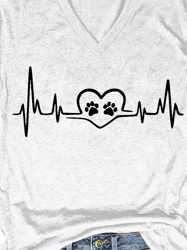 Women Funny Dog Love Heartbeat Loose V Neck T-Shirt