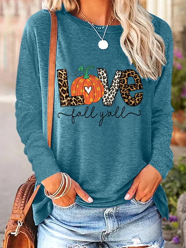 Women Love Pumpkin Print Halloween Cotton-Blend Top