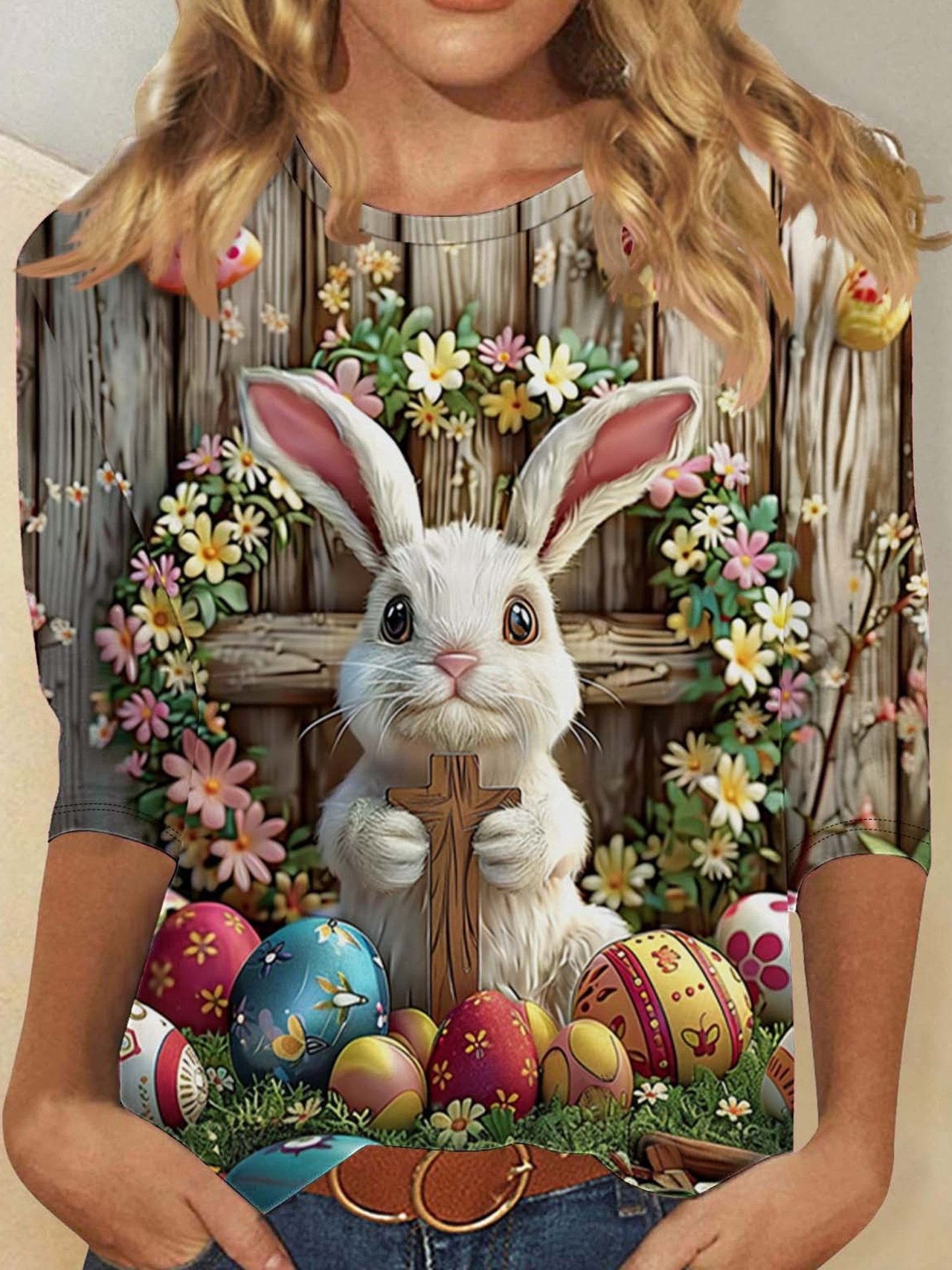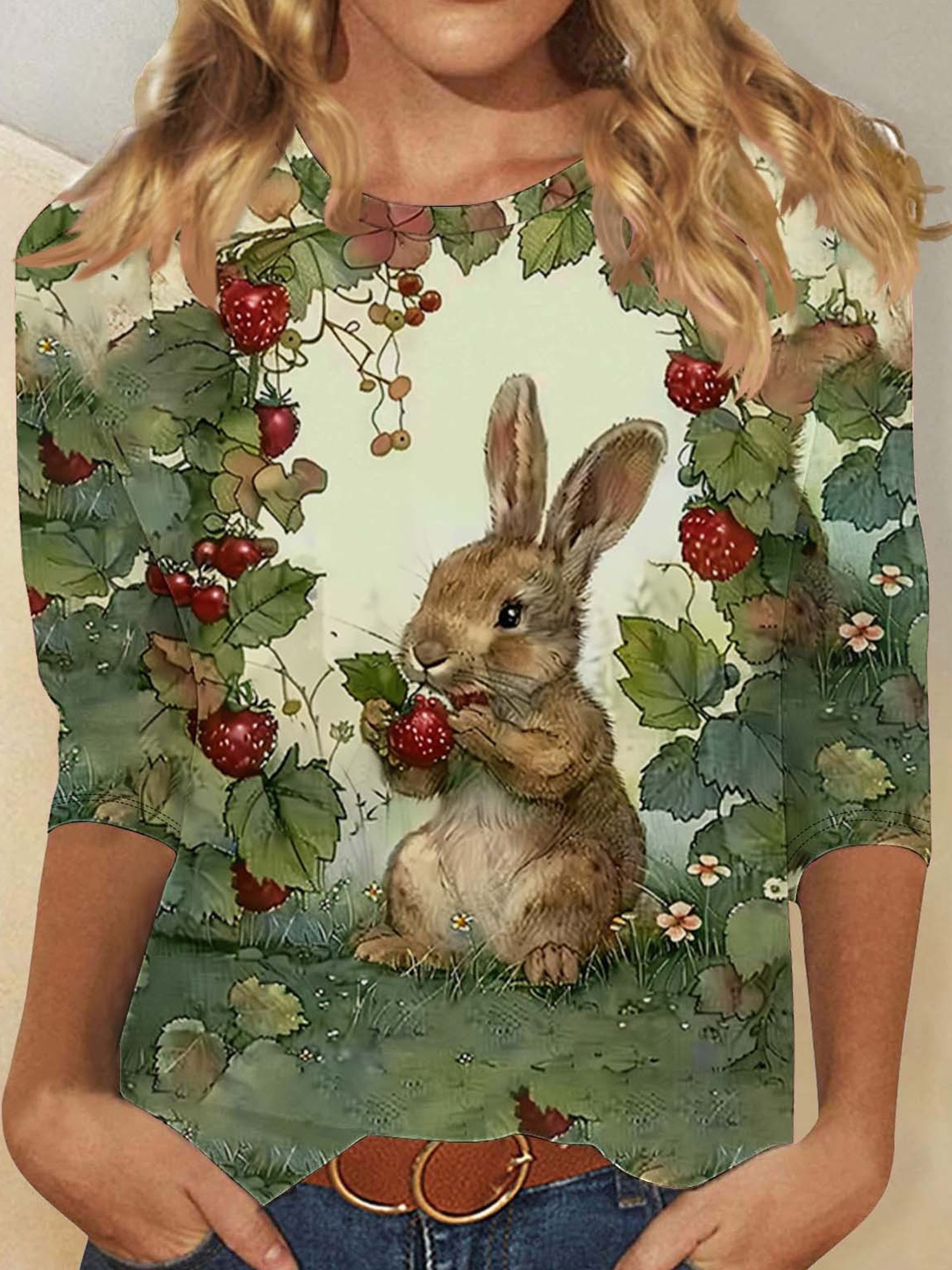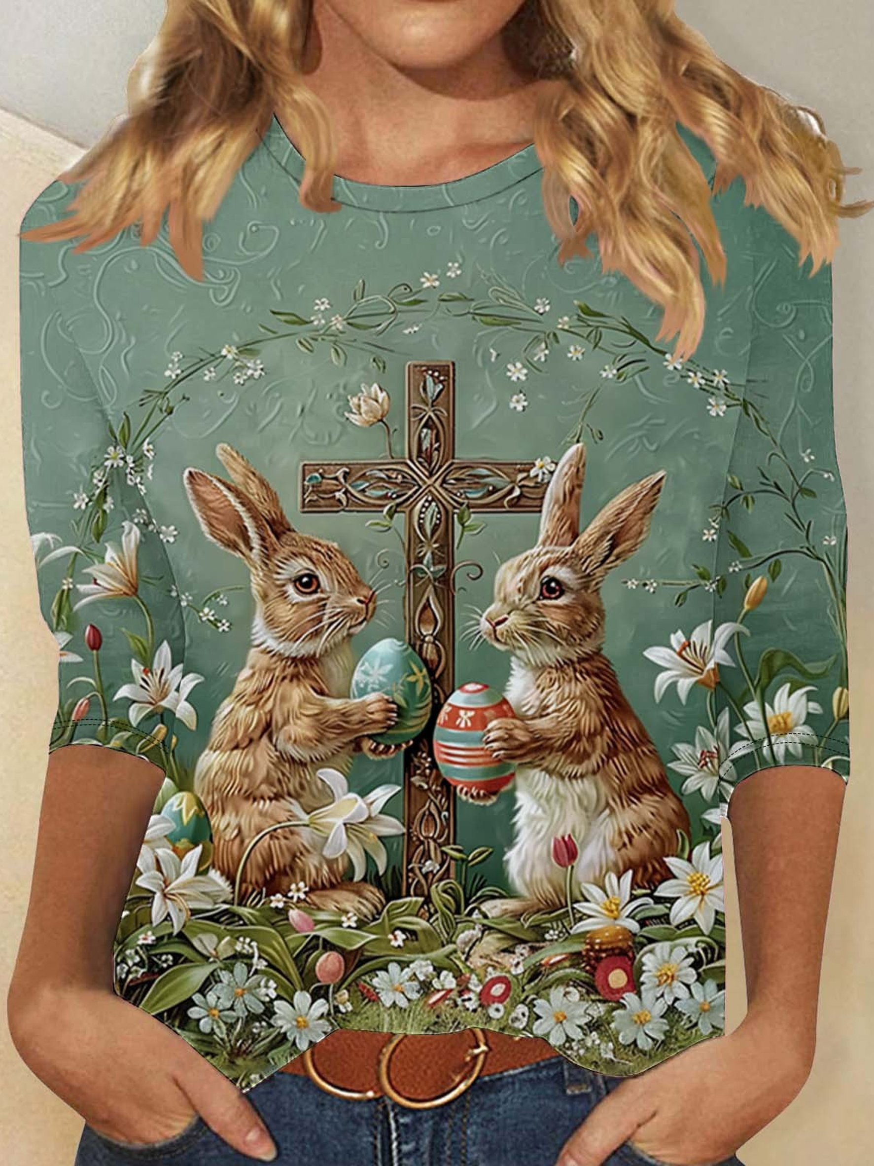 3D Printing Easter Rabbit Crew Neck Short Sleeve Floral Vintage Casual T-Shirt