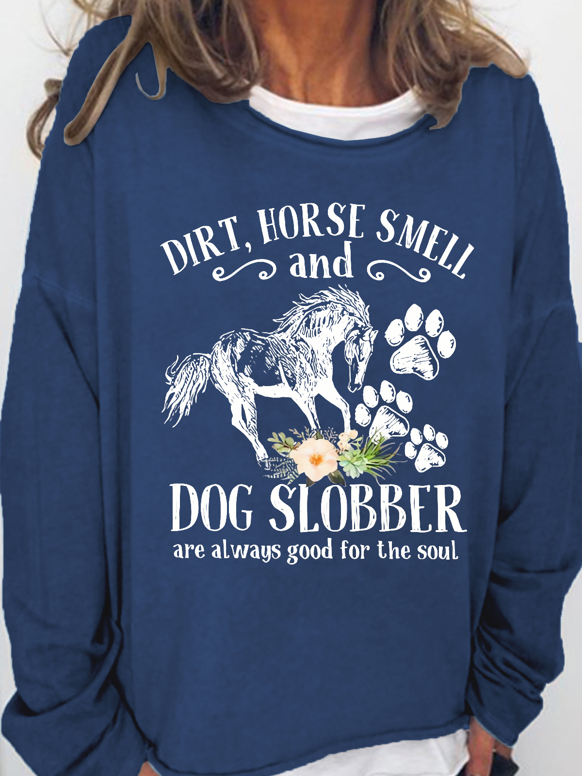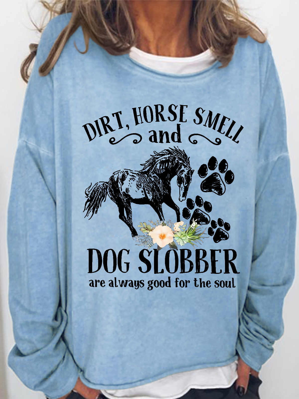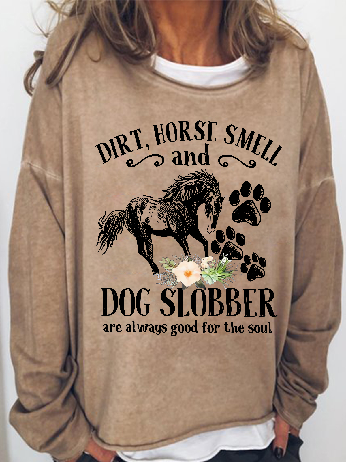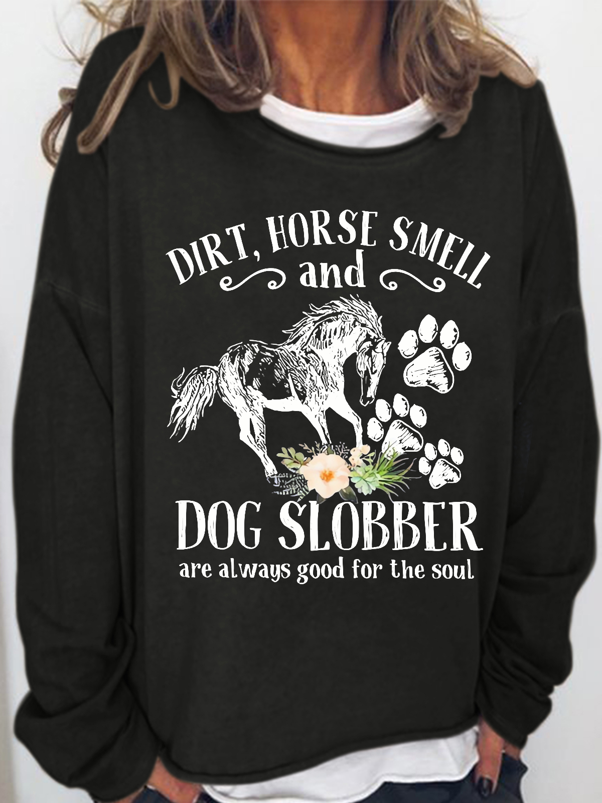 Women's Cute Horse And Dog Flower Dirt Horse Smell Simple Crew Neck Loose Sweatshirt