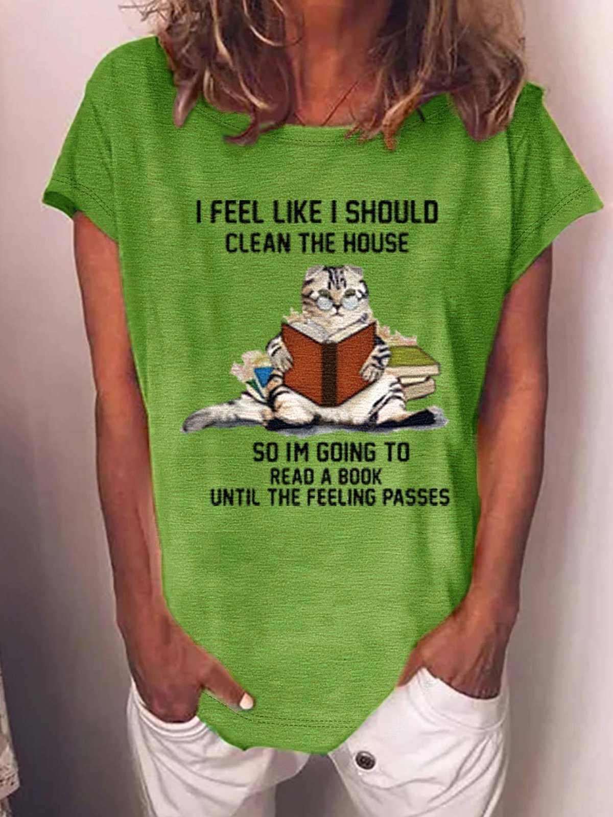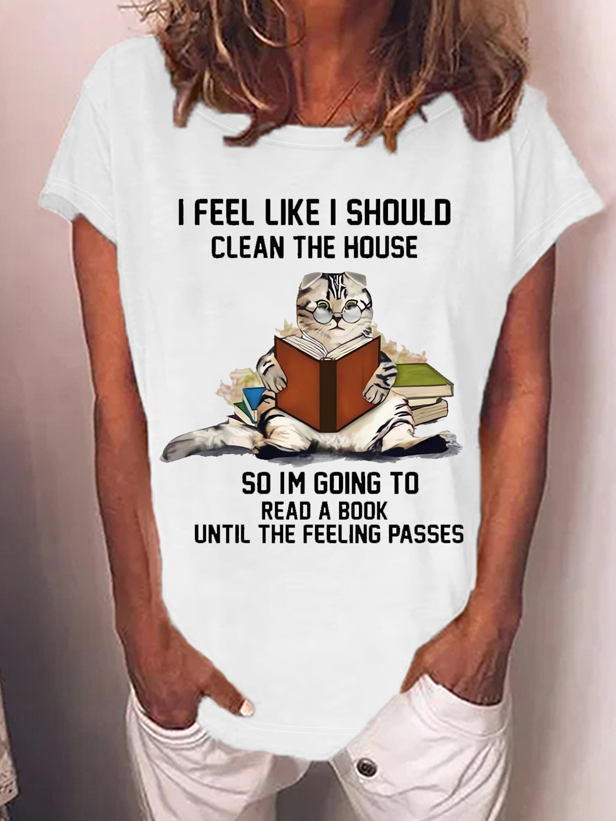 Women's Funny Cat I Feel Like I Should Clean The House So I'm Going To Read A Book Text Letters Crew Neck Loose Casual T-Shirt