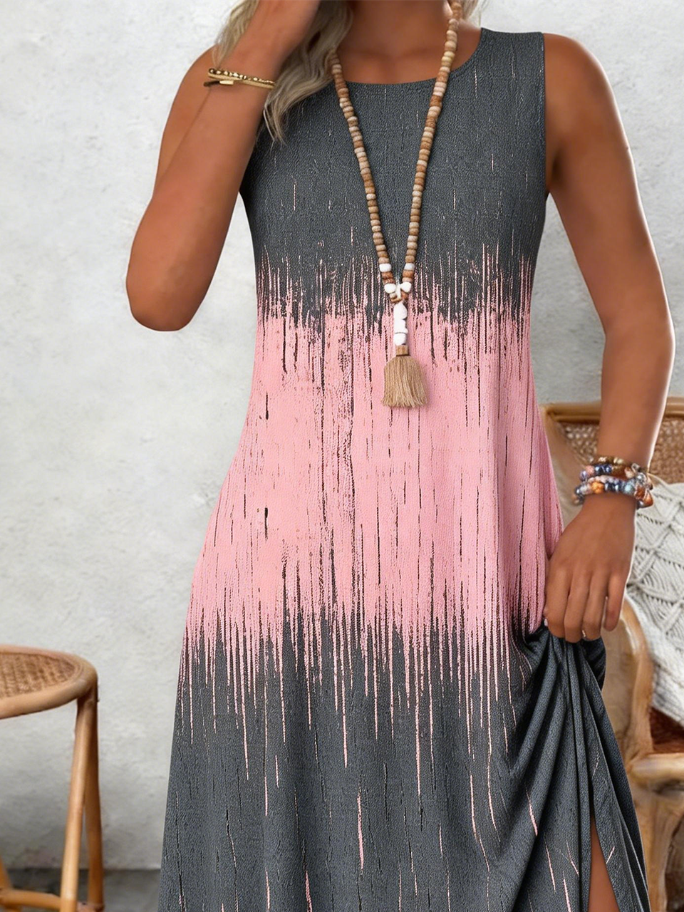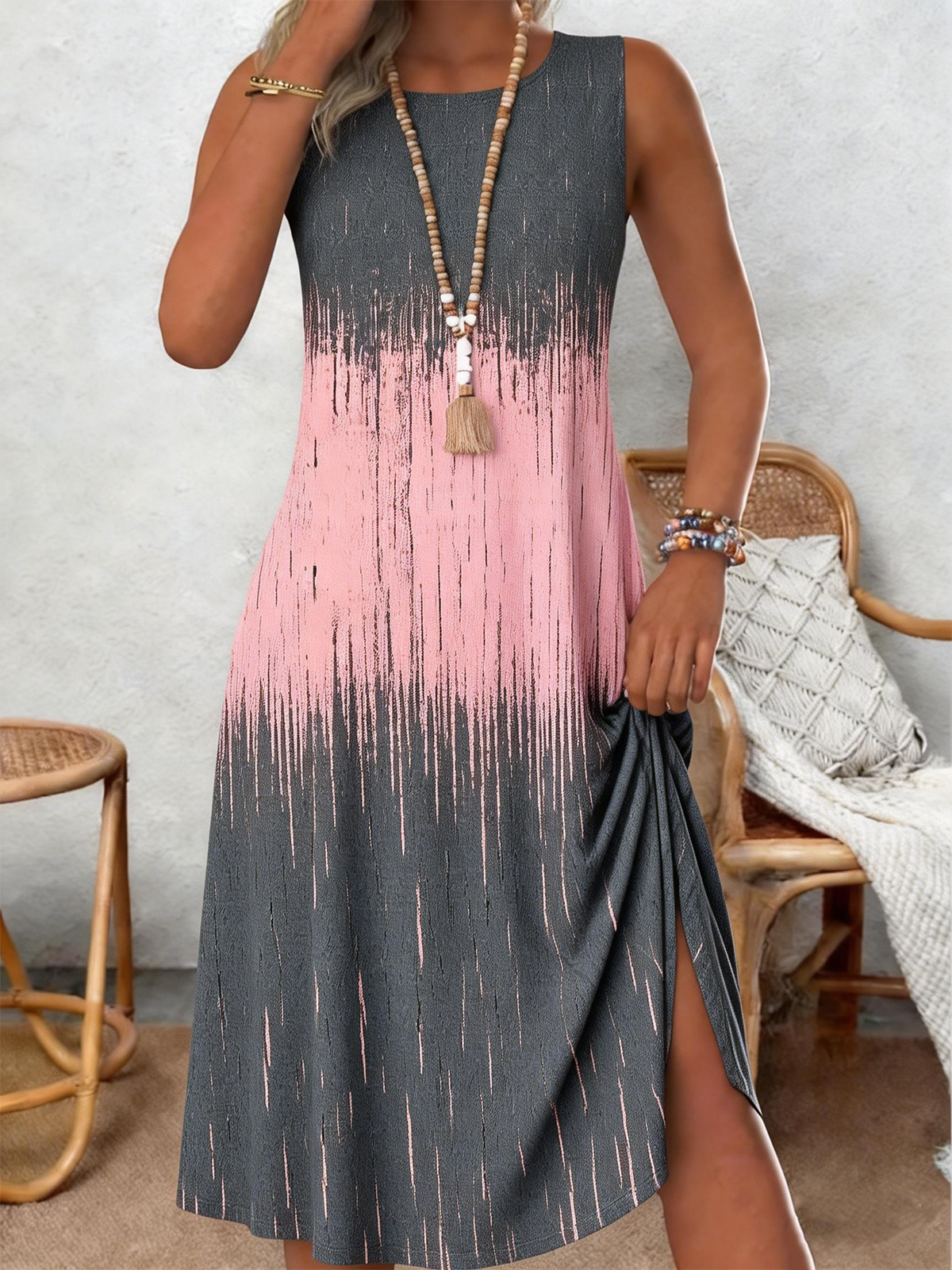 Crew Neck Loose Casual Gradient Pattern Dress With No