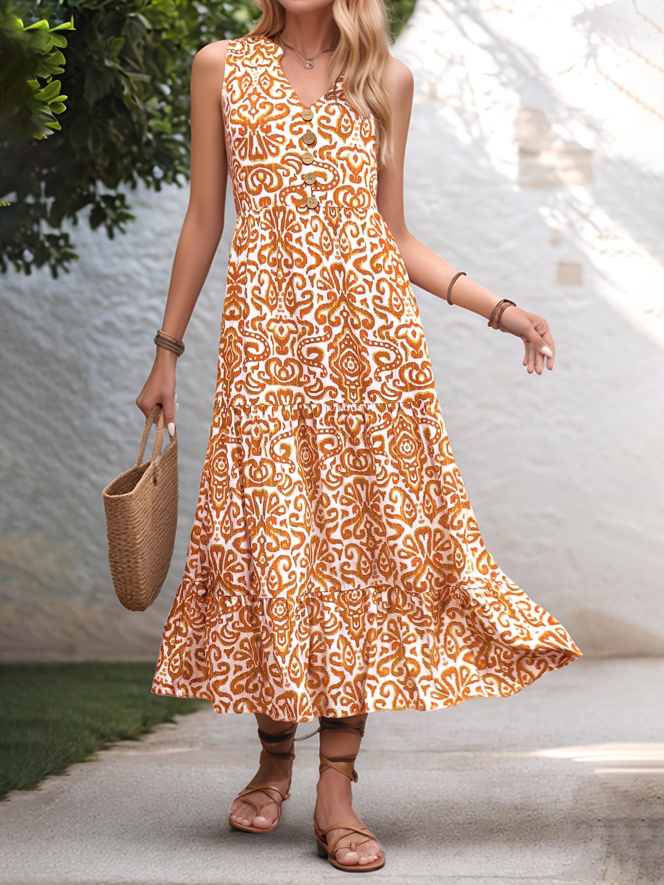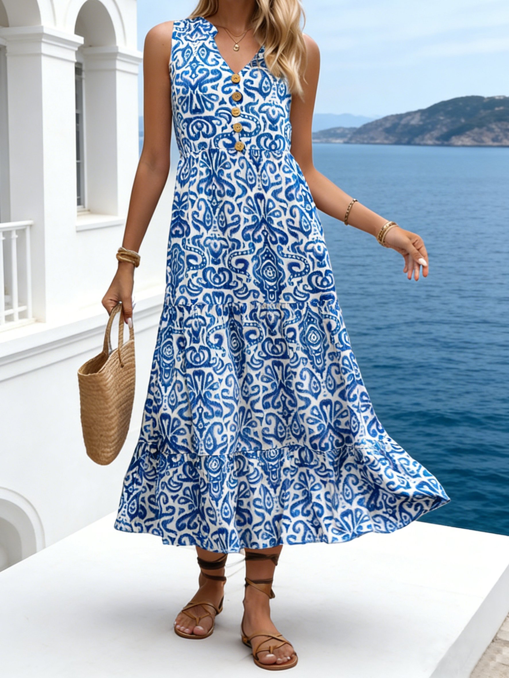 Elegant Ethnic Geometry V Neck Sleeveless Summer Vacation Going Out Elegant Maxi Dress