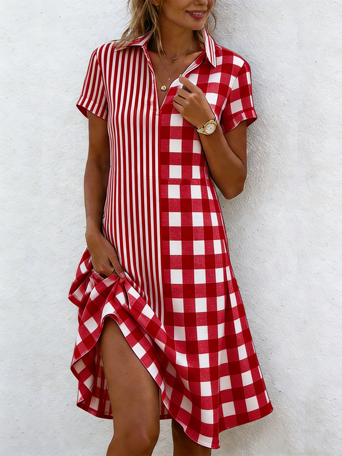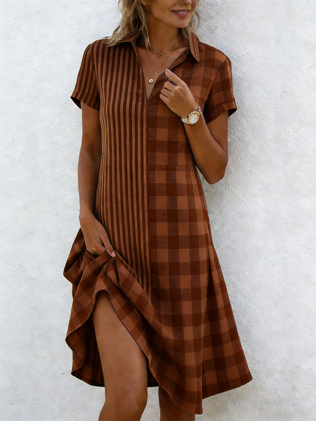 Elegant Loose Shawl Collar Geometric Shirt Dress With No