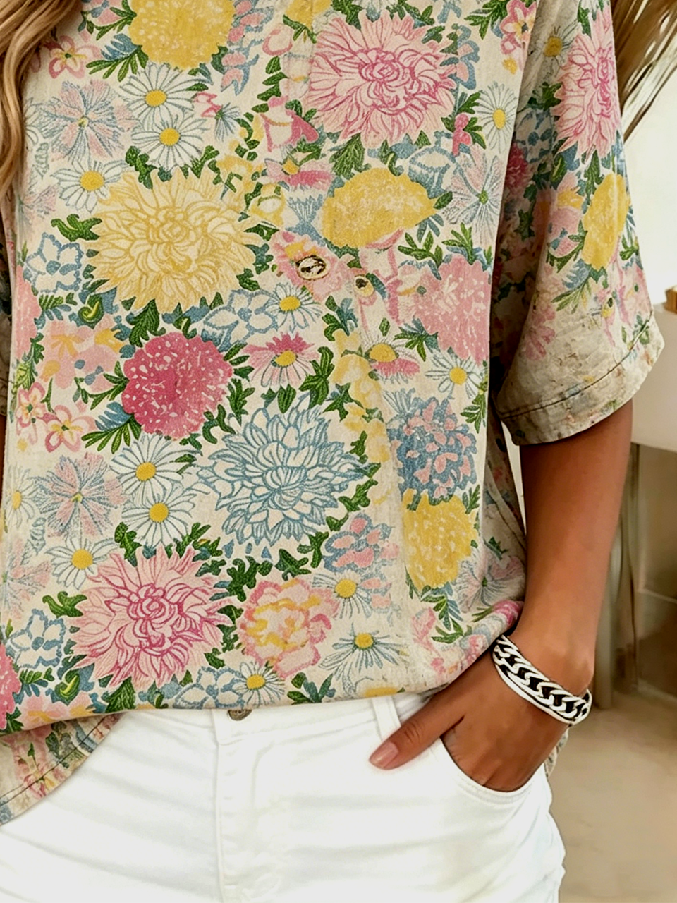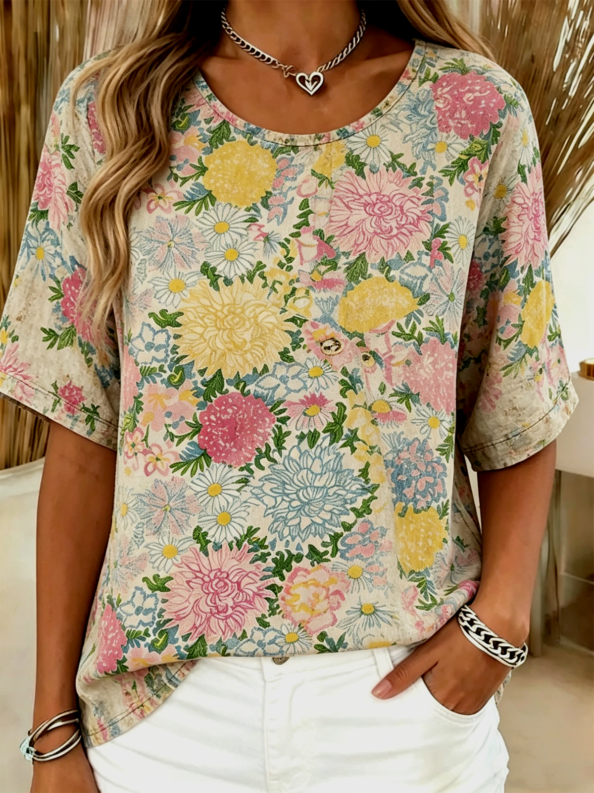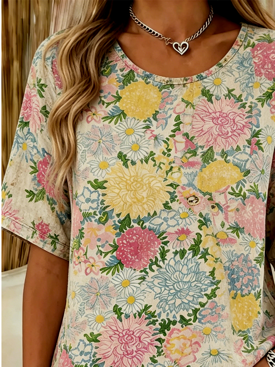 Floral Casual Cotton-Blend Crew Neck T-Shirt