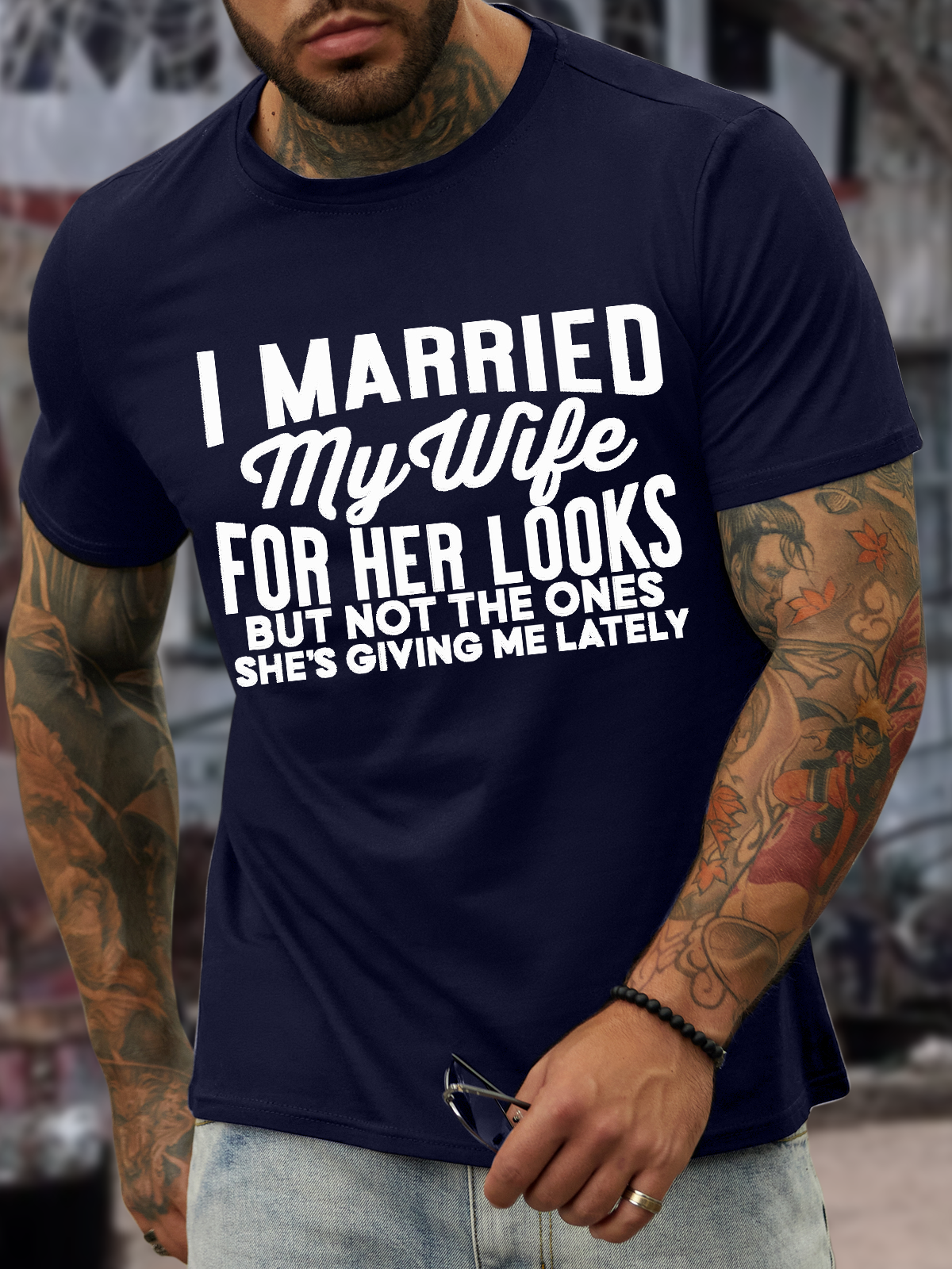 Men's I Merried My Wife For Her Looks But Not The Ones She's Giving Me Lately Casual Text Letters T-Shirt