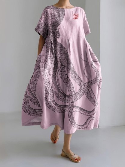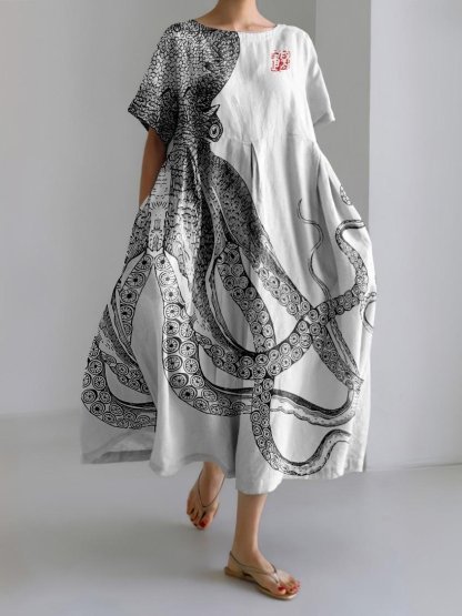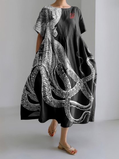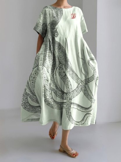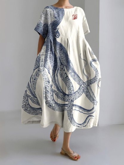Ocean Octopus Japanese Art Linen Blend Casual Dress