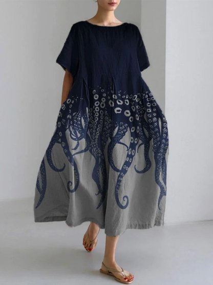 Ocean Octopus Japanese Art Linen Blend Casual Dress