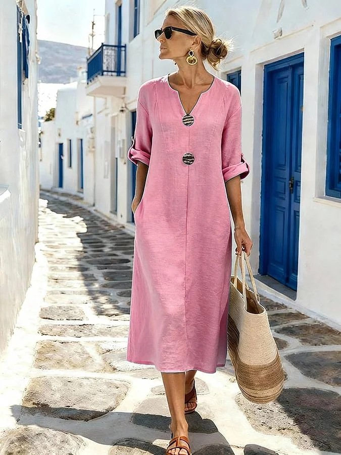 Plain Cotton And Linen VNeck The Quarter Sleeve Button Spring Summer Boho Dress