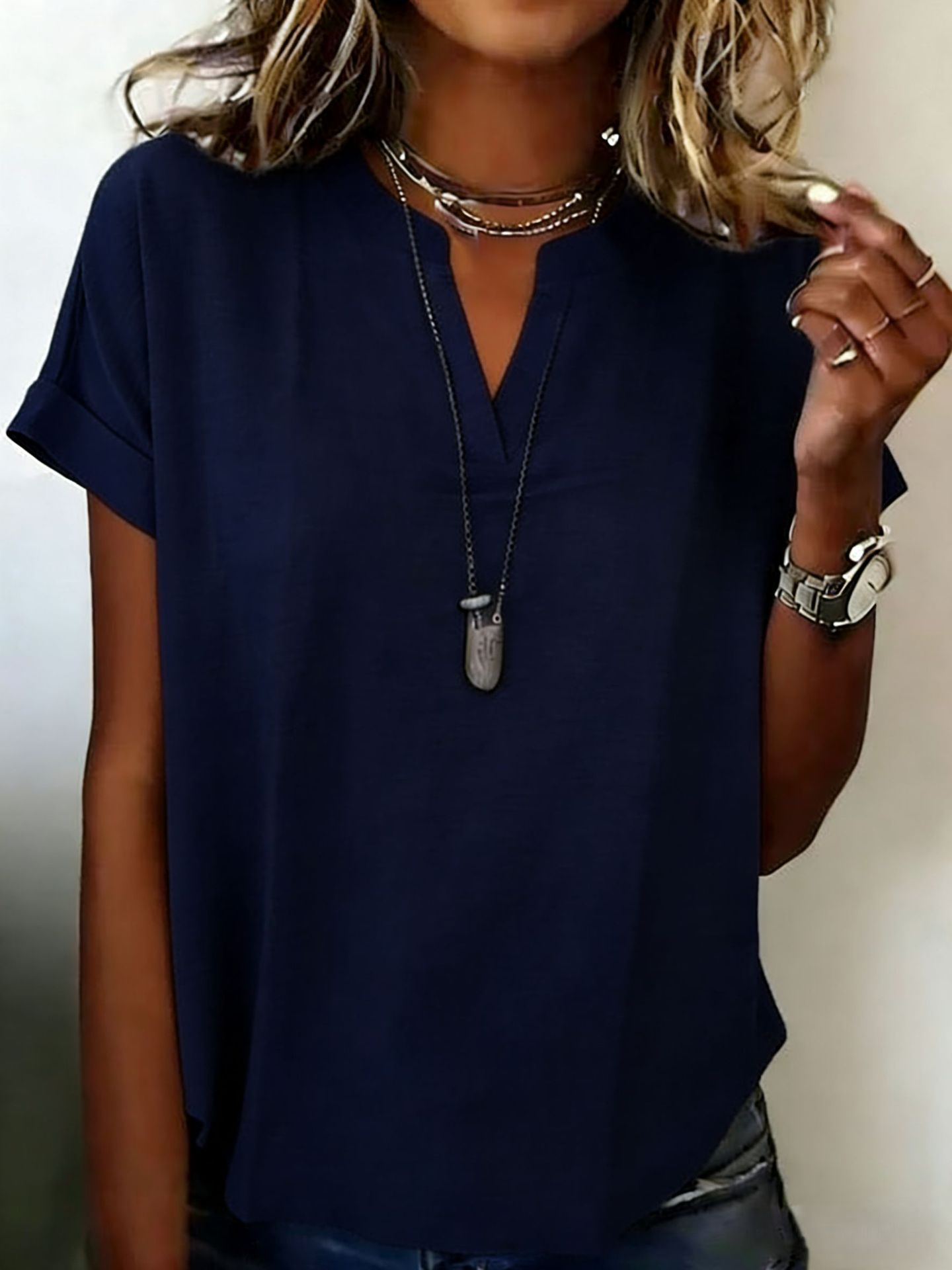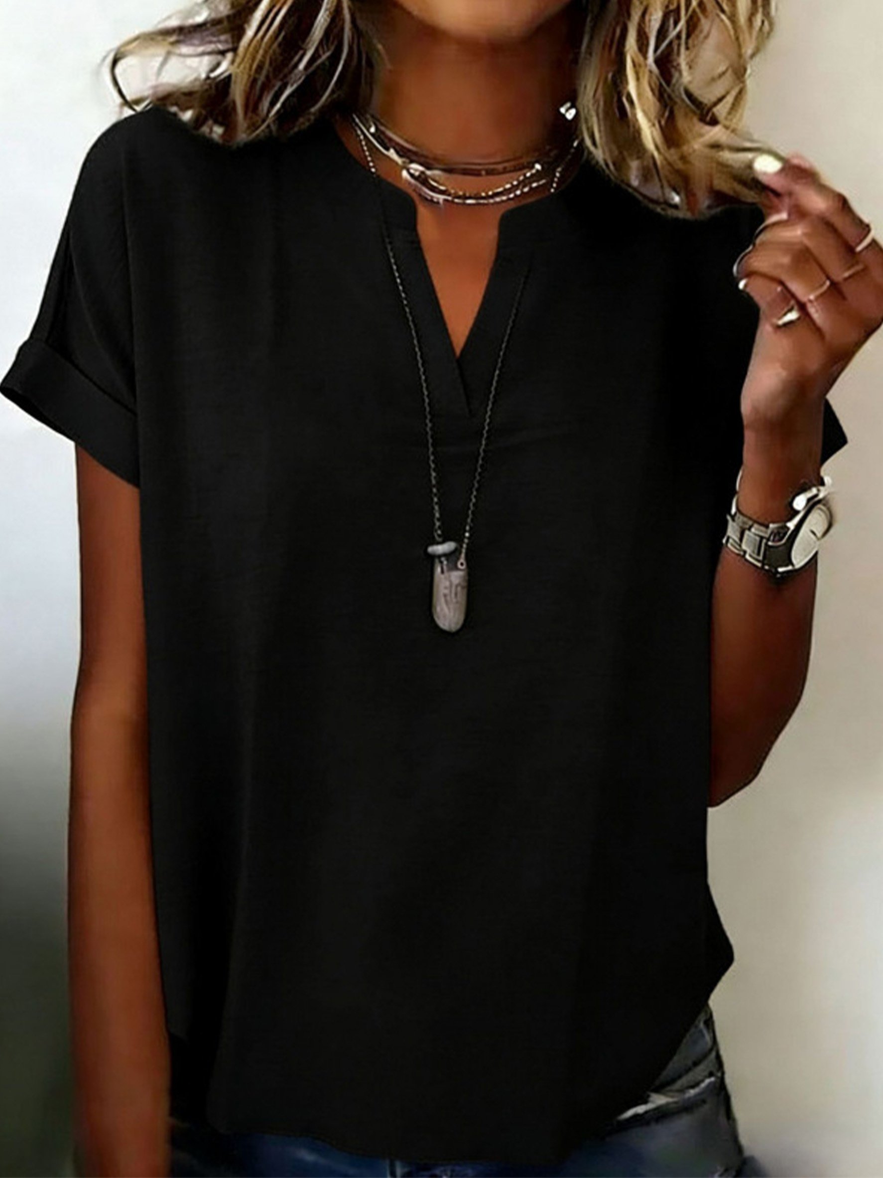 Polyester Cotton V Neck Short Sleeve Casual Blouse