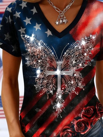 Vintage 3D Printing America Flag Floral Short Sleeve V Neck Butterfly Casual T-Shirt