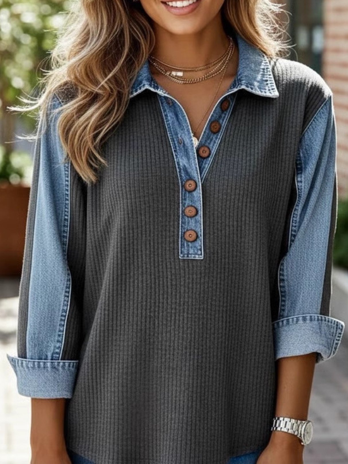Washed Denim Color Block Ribbing Shawl Collar Long Sleeve Casual Sweatshirt