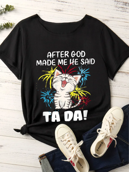 Women's Funny Cat After God Made Me He Said Ta Da Crew Neck Casual Cotton T-Shirt