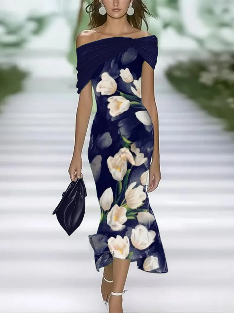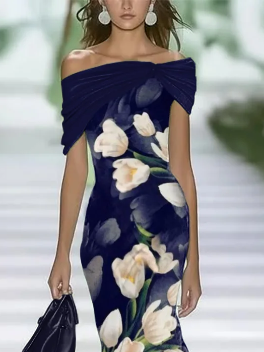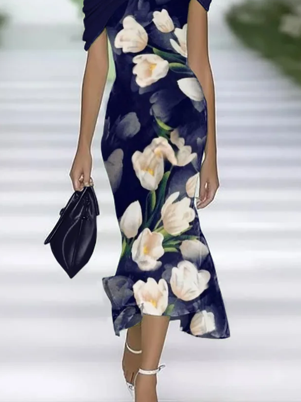 Women's Cap Sleeve Summer Purplish blue Floral Printing Cold Shoulder Daily Going Out Vintage Maxi H-Line Dress