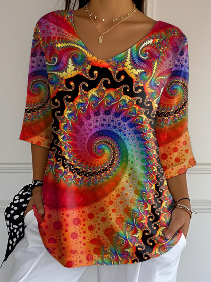 Women's Casual Rainbow Floral Cotton and Linen Bubble Wrinkle Top