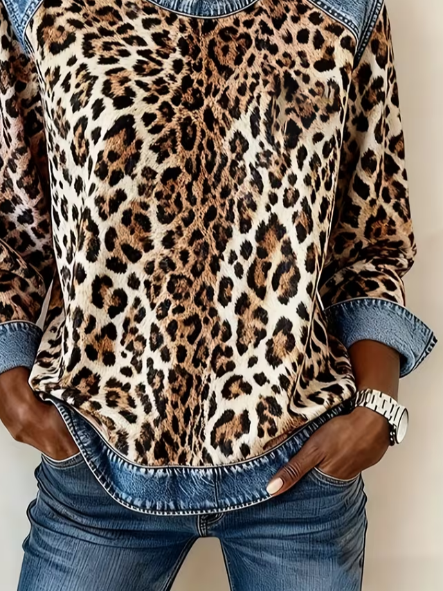 Women's Leopard Print Print Patchwork Denim Crewneck Long-Sleeved Sweatshirt