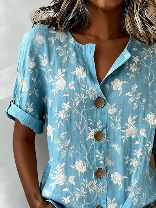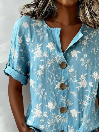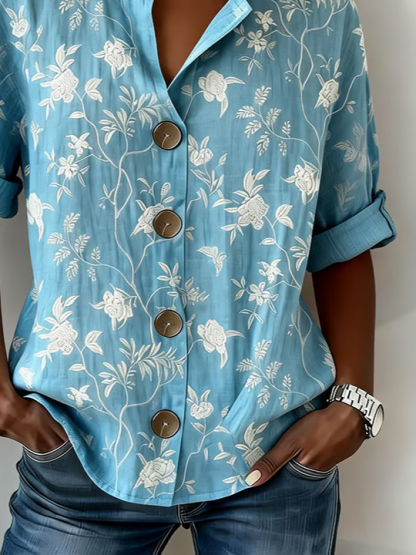 Women's Long Sleeve Shirt Spring/Fall Blue Floral Buckle Stand Collar Daily Going Out Casual Top