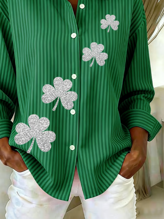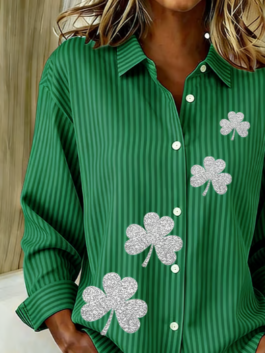 Women's Long Sleeve Shirt Spring/Fall Green Shamrock Buckle Shirt Collar Regular Sleeve Daily Going Out Casual Top