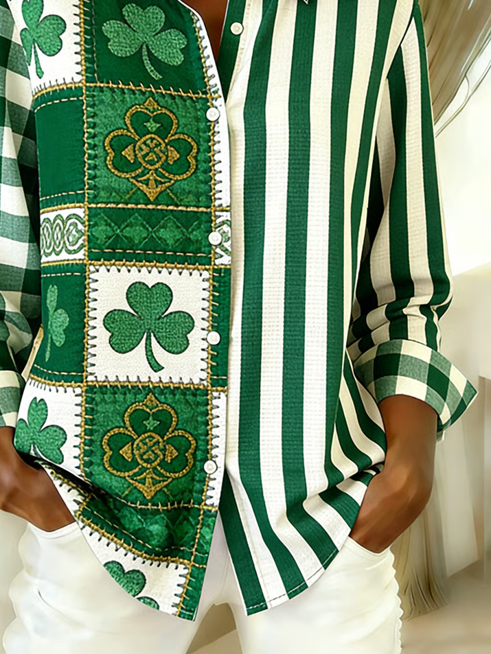 Women's Long Sleeve Shirt Spring/Fall Green Shamrock Buckle Shirt Collar Regular Sleeve Daily Going Out Casual Top